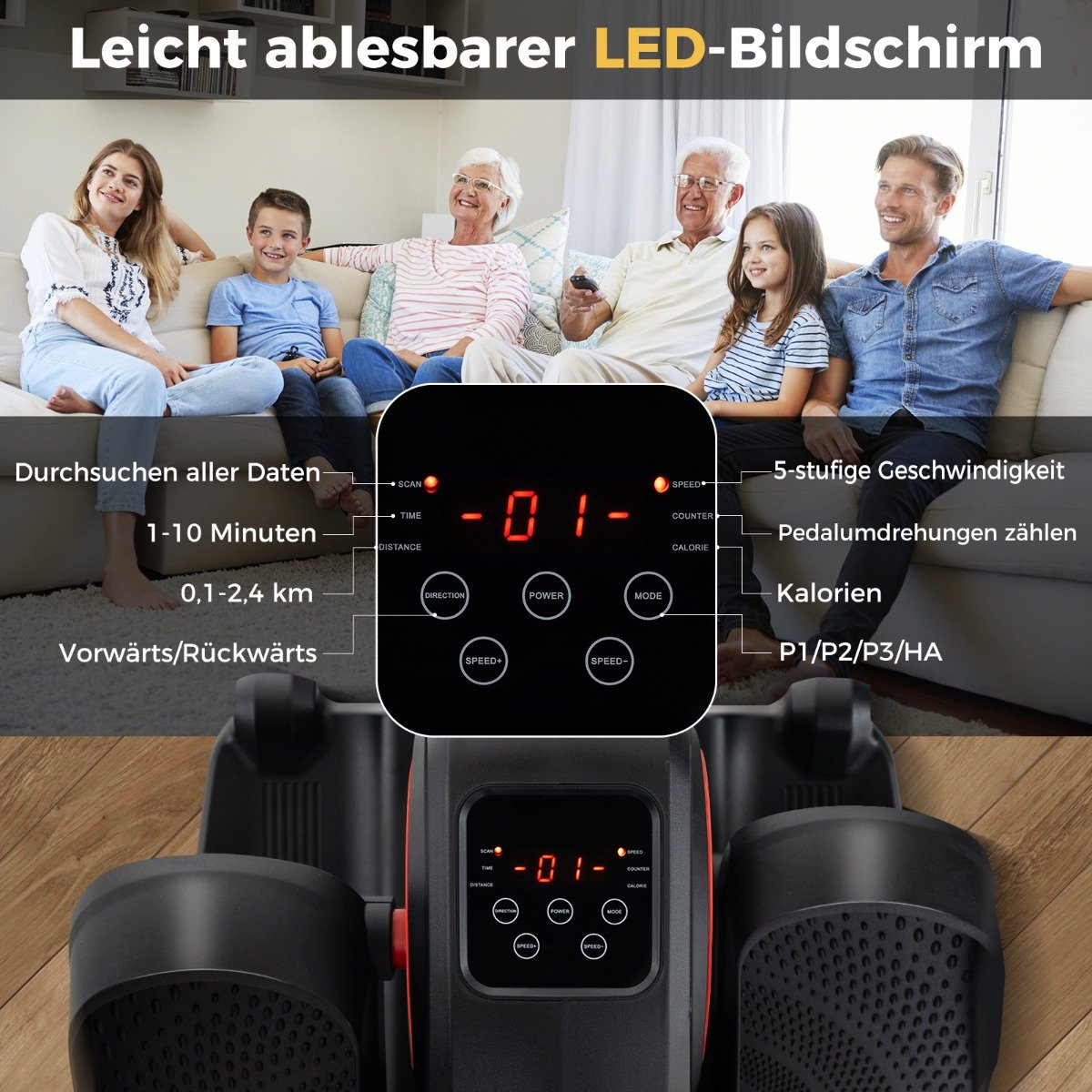 - Visapusiškas progreso stebėjimas: aiškus ekranas rodo greitį, laiką, atstumą, apsisukimus ir sudegintas kalorijas.
