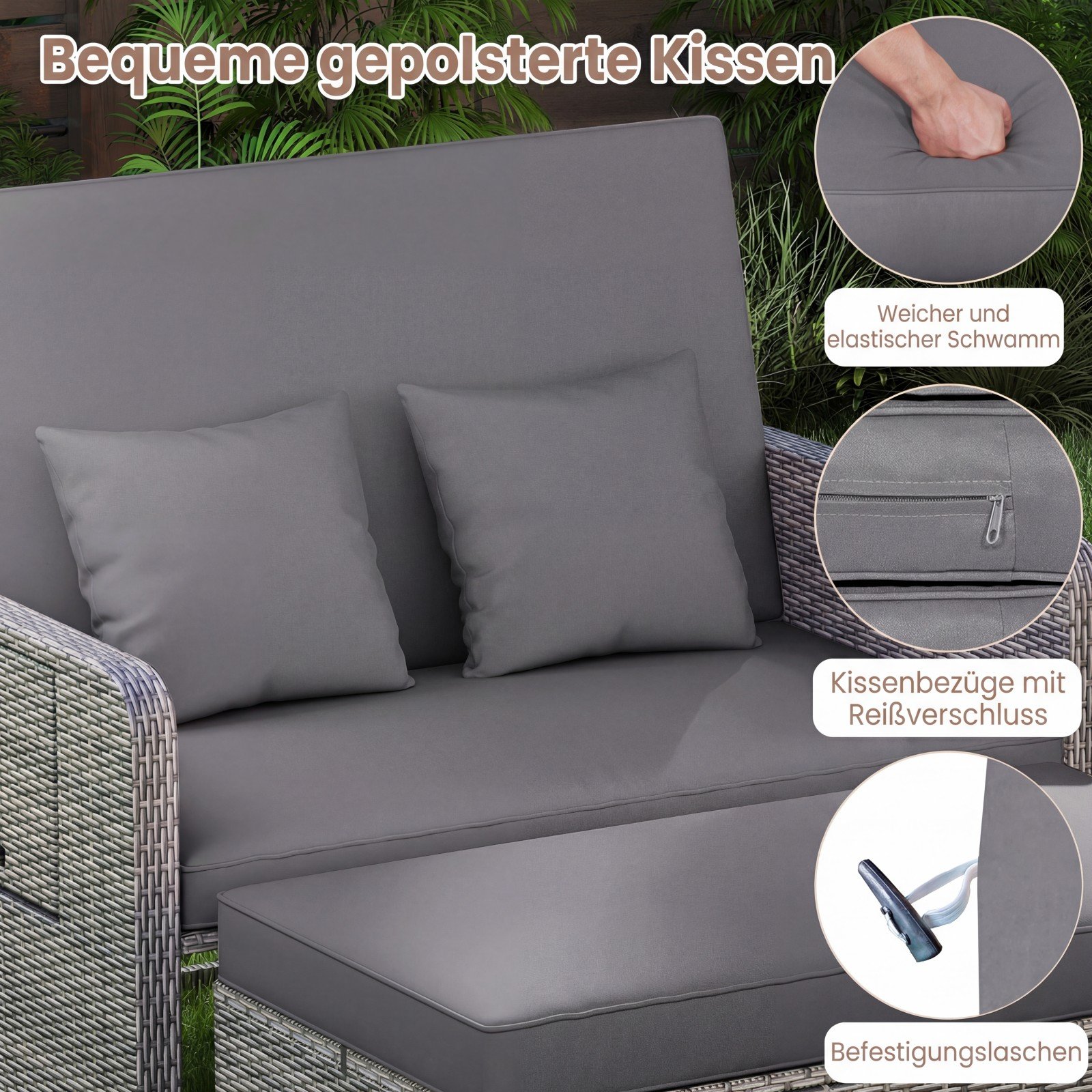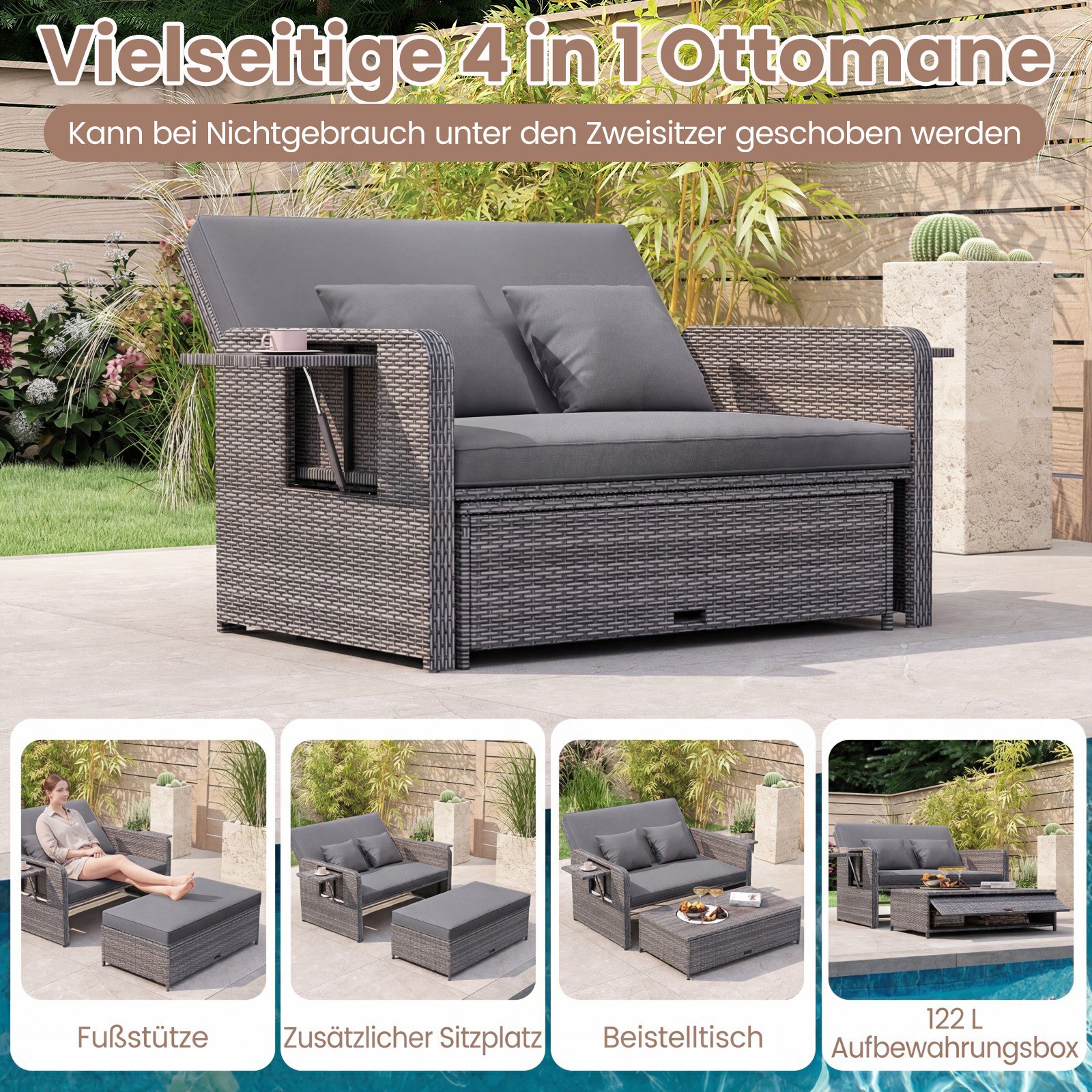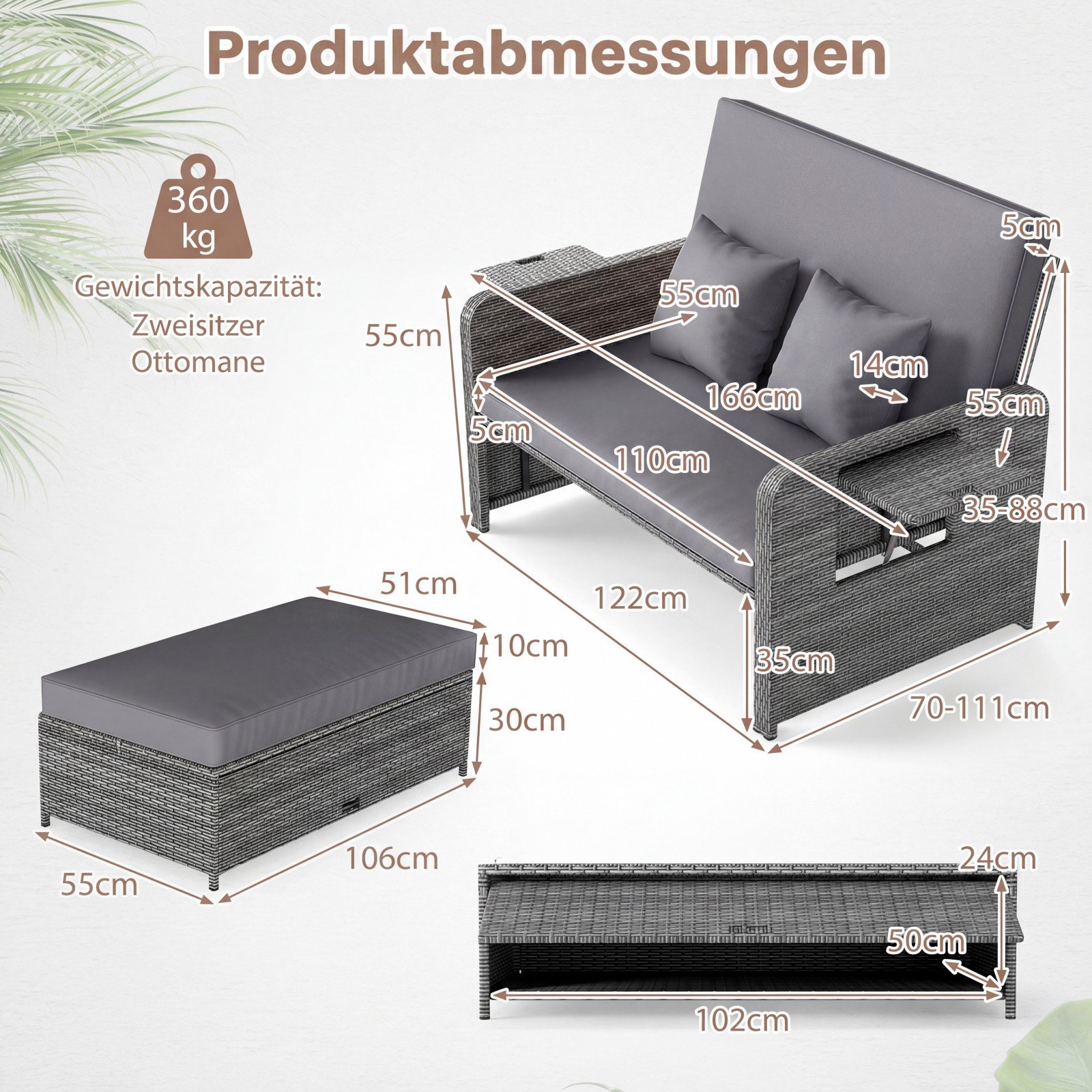 Pajuskite maksimalų komfortą ir stilių lauke su šia universalia lauko sofa, sukurta Jūsų tobuloms poilsio akimirkoms. Jos keturių padėčių reguliuojama nugaros atrama puikiai prisitaikys prie Jūsų poreikių, leisdama patogiai mėgautis saule, skaityti knygą ar tiesiog atsipalaiduoti. Pagaminta iš aukštos kokybės PE ratano ir tvirto metalinio rėmo, ši sofa yra ilgaamžė, atspari oro sąlygoms ir kartu su pufu atlaiko iki 360 kg svorį.