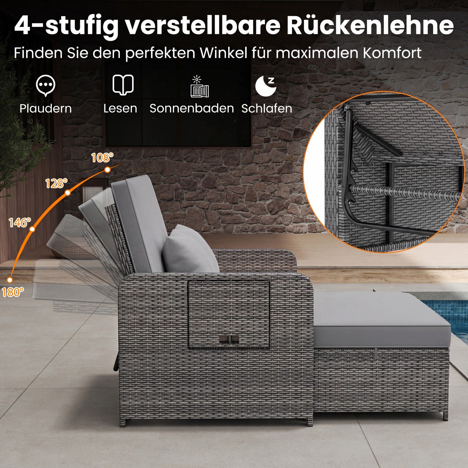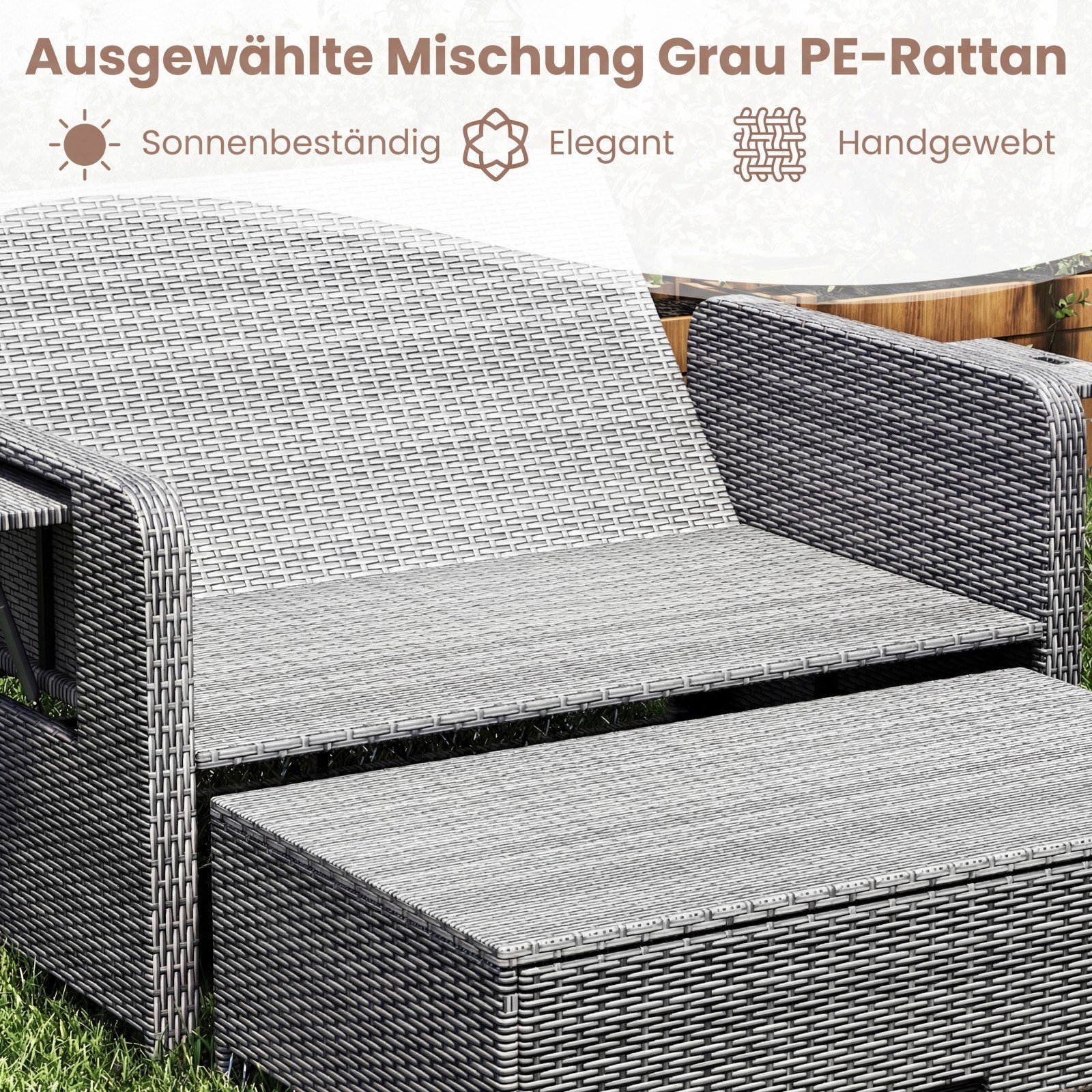Poliratano lauko sofa su reguliuojama atrama nugarai ir išskleidžiamais staliukais (Pilka)