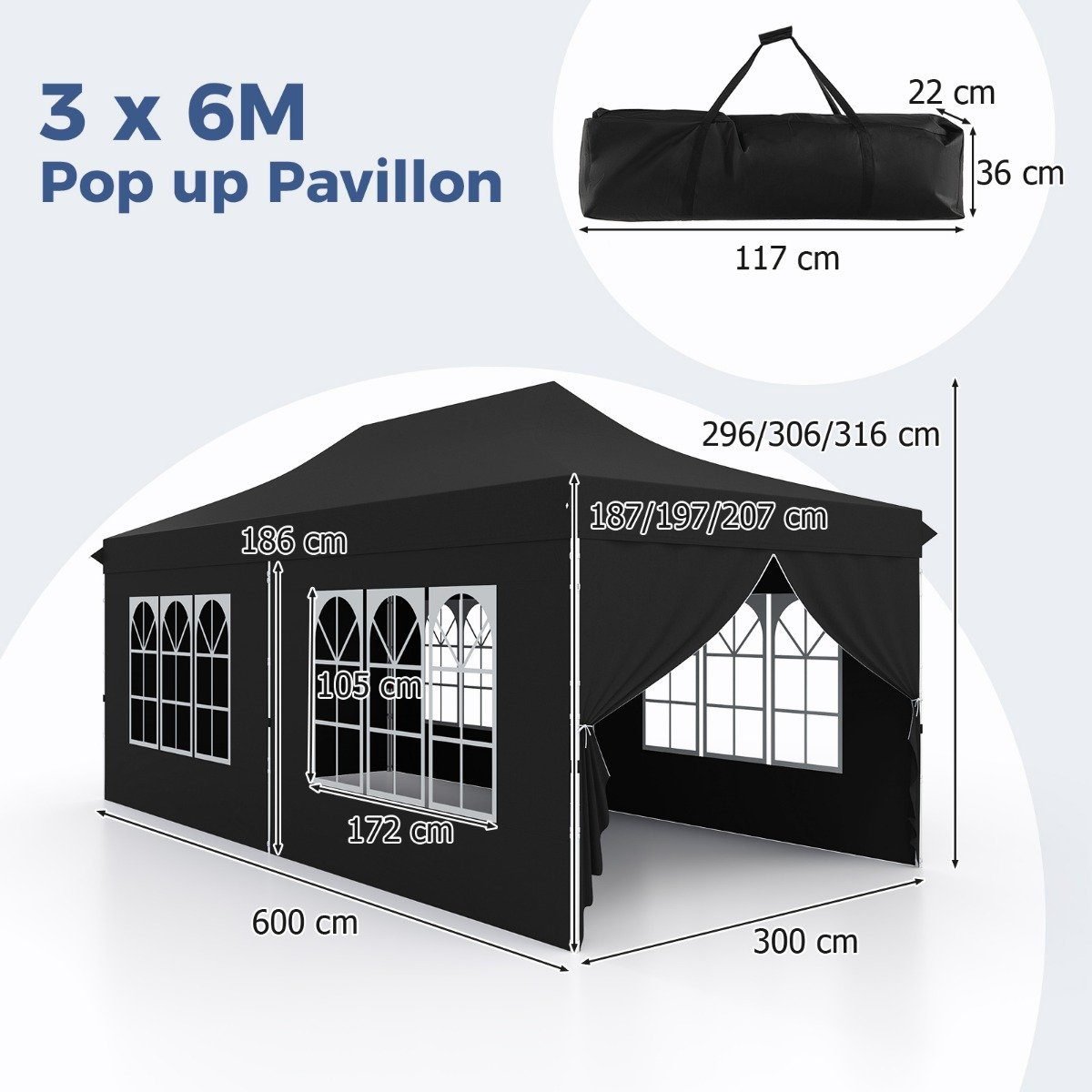 Pop-up pavėsinė 3×6 m su šešiomis sienelėmis (Juoda)