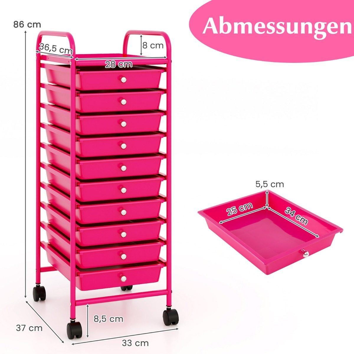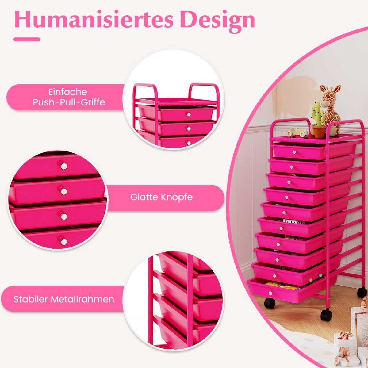 Praktiška daiktadėžė su dešimčia stalčių ir ratukais (Karšto rožinė)