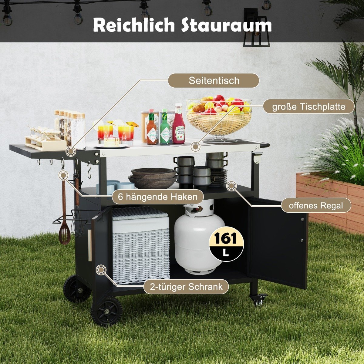 - Didelis stalviršis, atvira lentyna ir 163 litrų talpos dviejų durų spintelė puikiai tinka laikyti kepsninės įrankius, prieskonius ir aksesuarus.