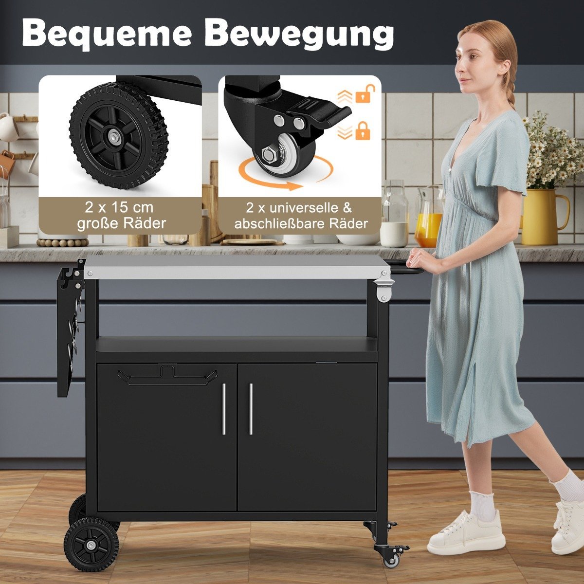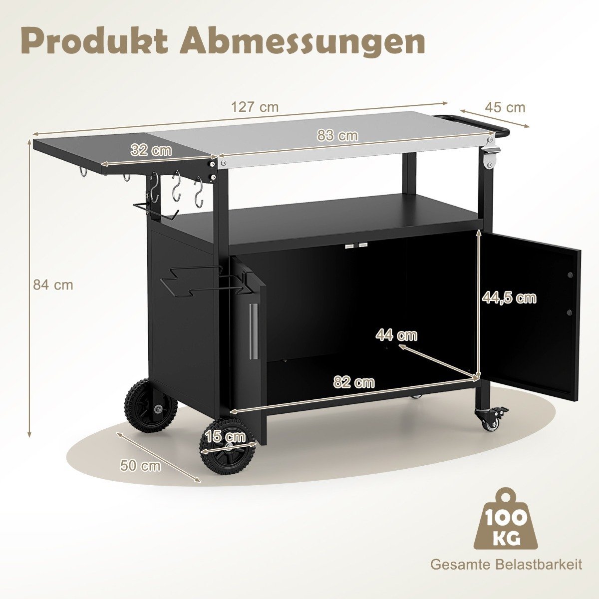 Pagerinkite savo lauko maisto gaminimo patirtį su šiuo funkcionaliu kepsninės vežimėliu, sukurtu užtikrinti patogumą ir universalumą ruošiant maistą. Jame yra didelis nerūdijančio plieno stalviršis, erdvi dviejų durų spintelė ir papildoma atvira lentyna, suteikiantys pakankamai vietos laikyti viskam, ko reikia.