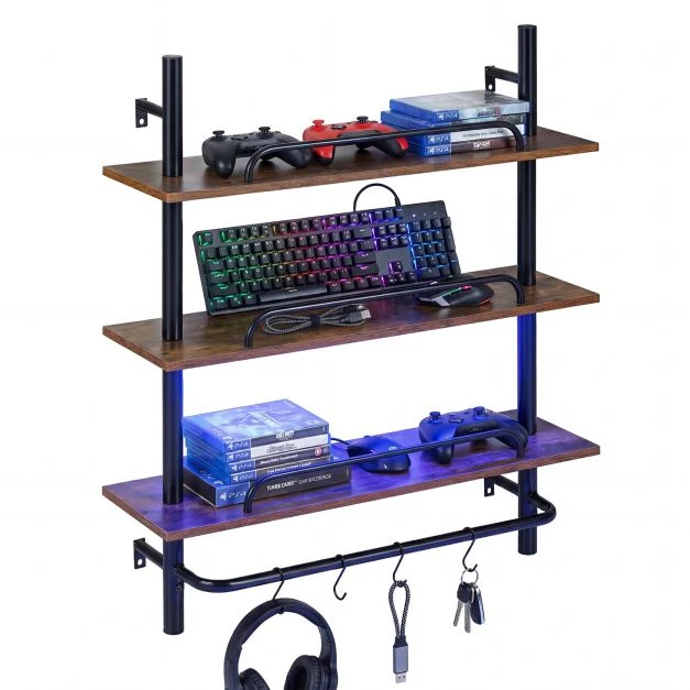 Pramoninio stiliaus 3 pakopų sieninė lentyna su LED apšvietimu ir S formos kabliais (Rūdžių ruda)