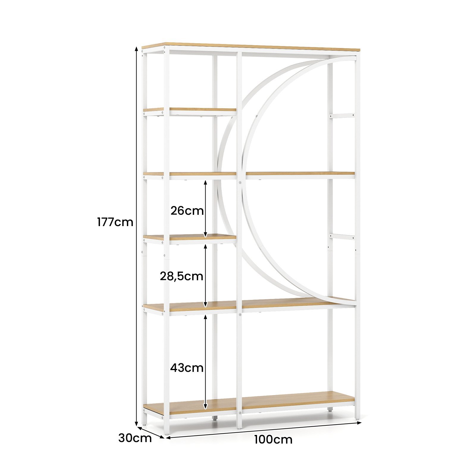 Pramoninio stiliaus 6 aukštų knygų lentyna su atviromis lentynomis ir pusmėnulio formos dizainu (Balta)