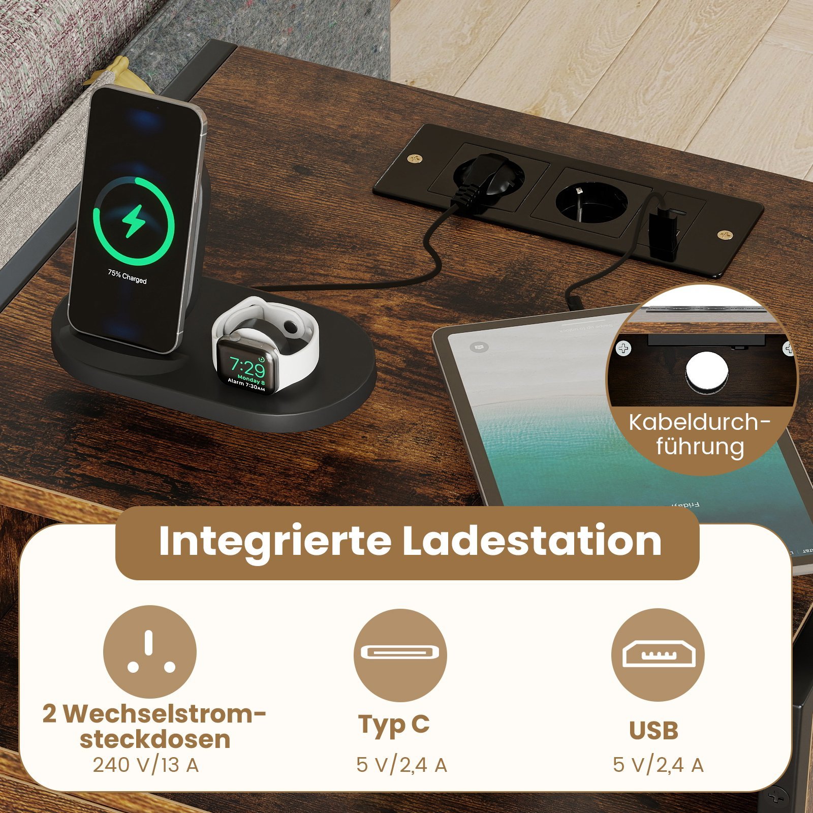 - Integruota įkrovimo stotelė su 2 elektros lizdais, USB ir C tipo jungtimis.