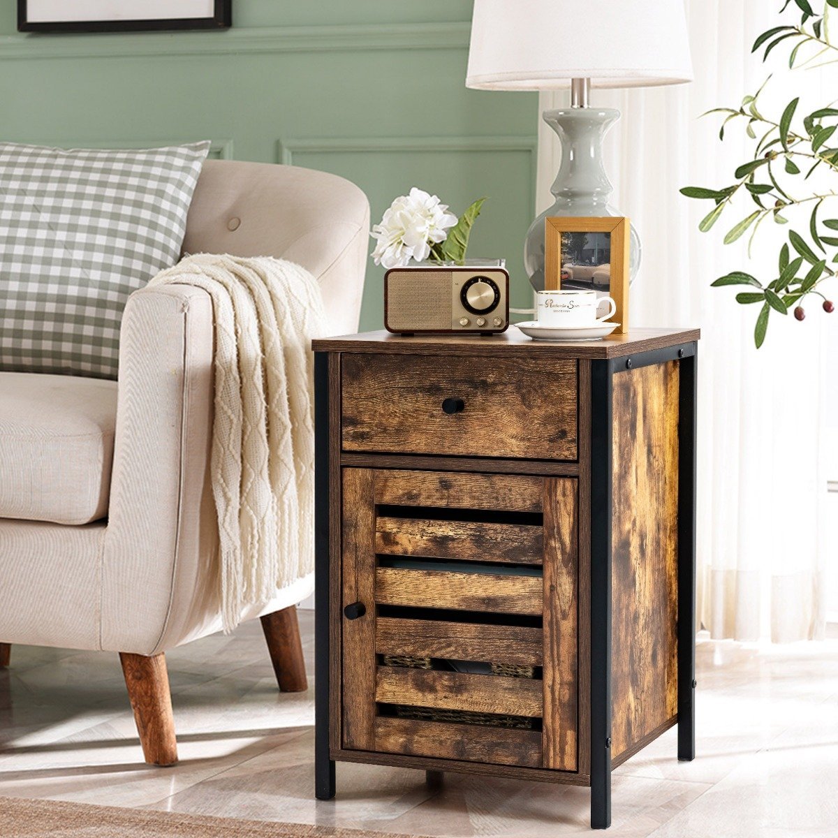 Pramoninio stiliaus naktinis staliukas su reguliuojama lentyna (Rustiška ruda)