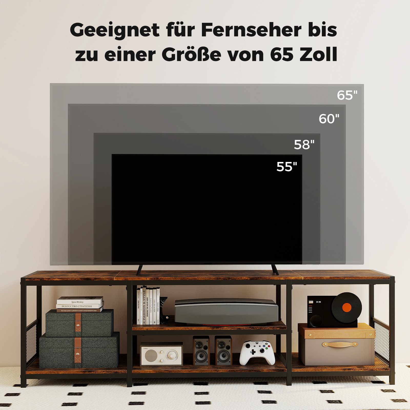 Ši elegantiška televizoriaus spintelė, skirta televizoriams iki 65 colių, puikiai derina stilių ir funkcionalumą. Joje rasite erdvią viršutinę dalį ir kelias atviras lentynas, skirtas tvarkingai laikyti jūsų elektroniką, knygas ir dekoracijas. Tvirtas metalinis rėmas ir reguliuojamos kojelės užtikrina stabilumą bei ilgaamžiškumą, o pramoninio stiliaus dizainas įneša modernumo į bet kokį interjerą.