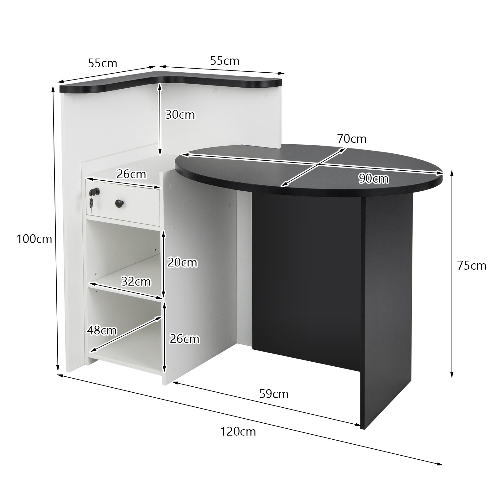 Priėmimo stalas su rakinamu stalčiumi ir reguliuojama lentyna (Juoda ir balta)