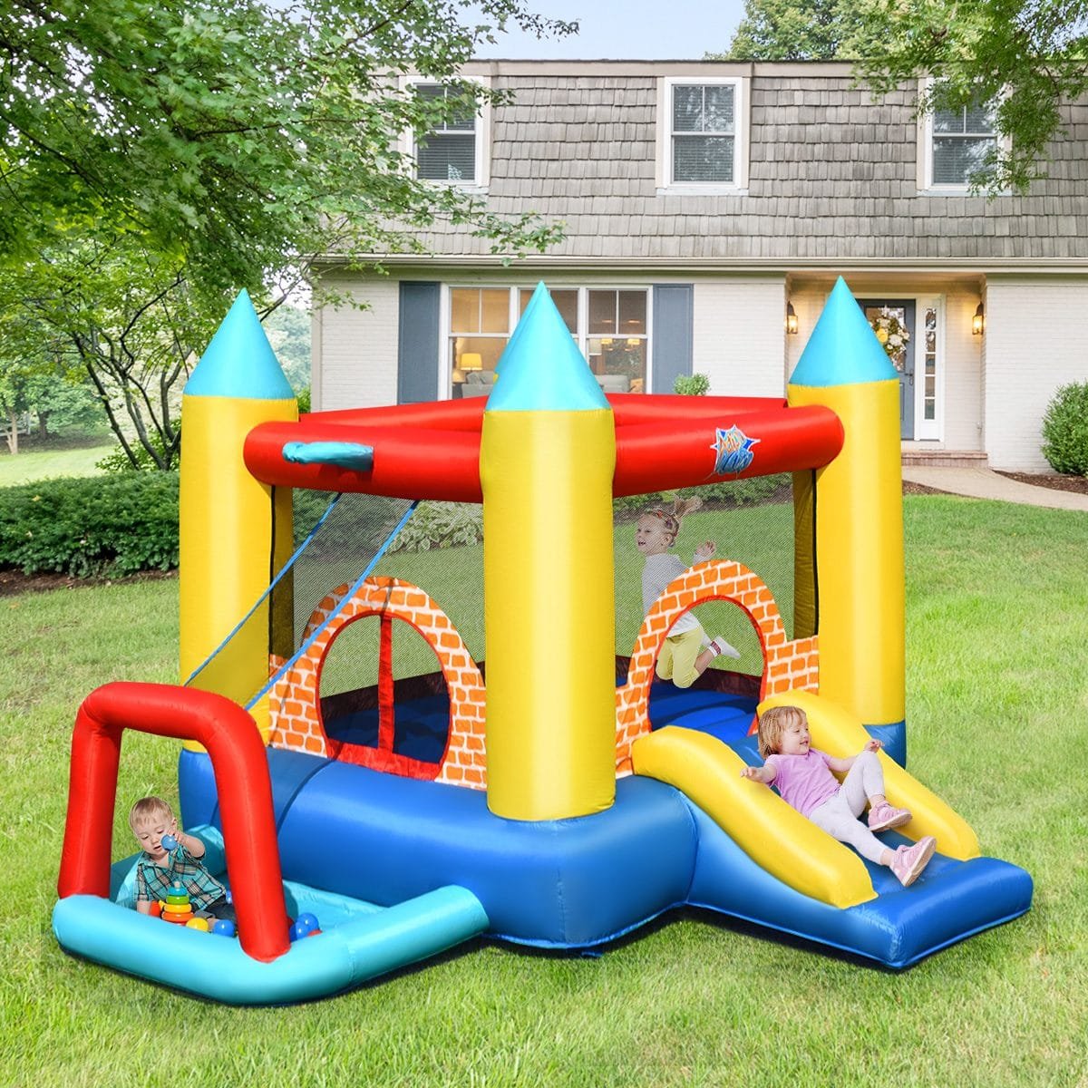 Pripučiama pilis su čiuožykla ir kamuoliukais (Įvairiaspalvė)