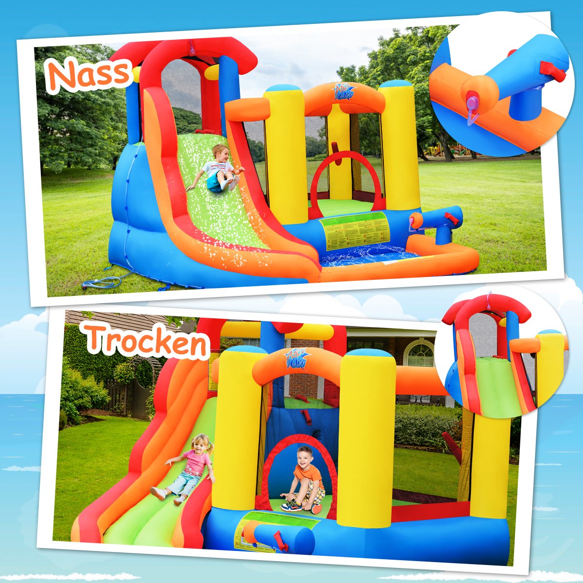 - Įvairios žaidimų zonos: vandens čiuožykla, laipiojimo sienelė, krepšinio lankas ir baseinas su vandens patranka.