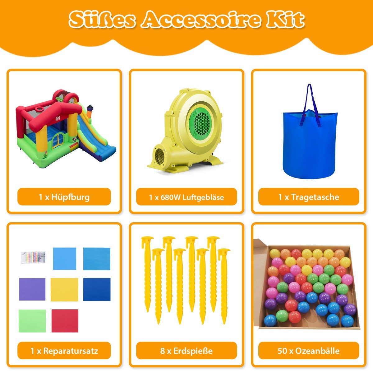 Pripučiama vaikų žaidimų pilis su čiuožykla ir krepšinio lenta (Spalvota)