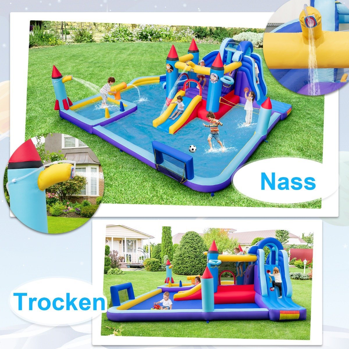 Padovanokite vaikams nepamirštamų pramogų su šiuo unikaliu pripučiamu vandens parku. Tobulai tinkamas karštoms vasaros dienoms, jis siūlo daugybę žaidimo variantų, skatinančių fizinį aktyvumą ir azartą.