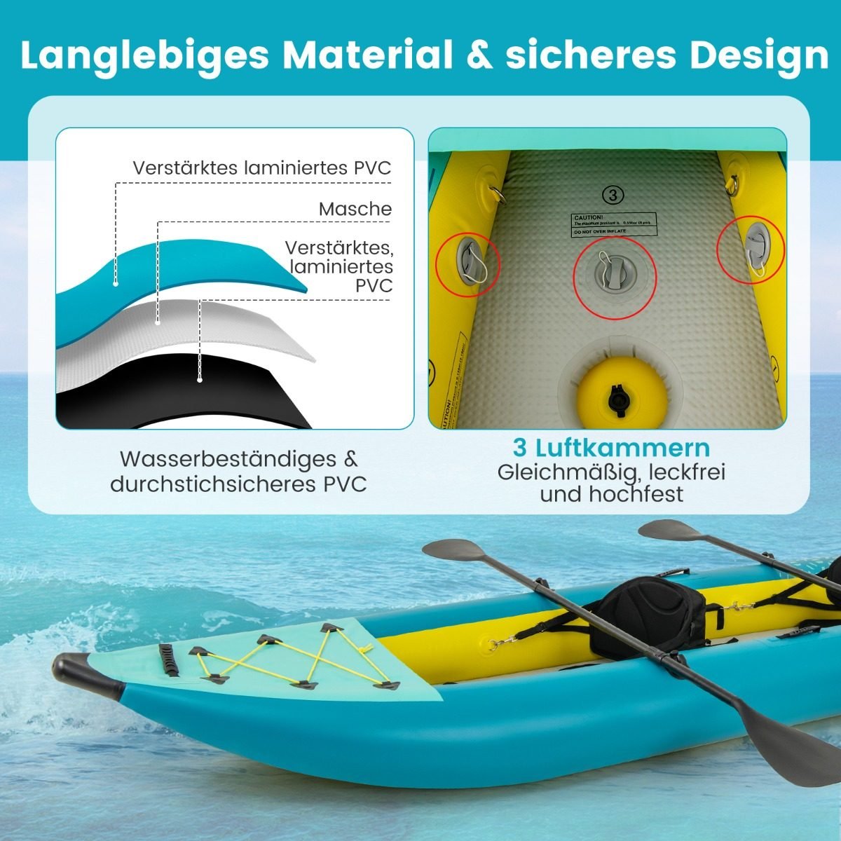 - Saugus, manevringas ir stabilus plaukimas su aliumininiais irklais ir krypties pelekais.
