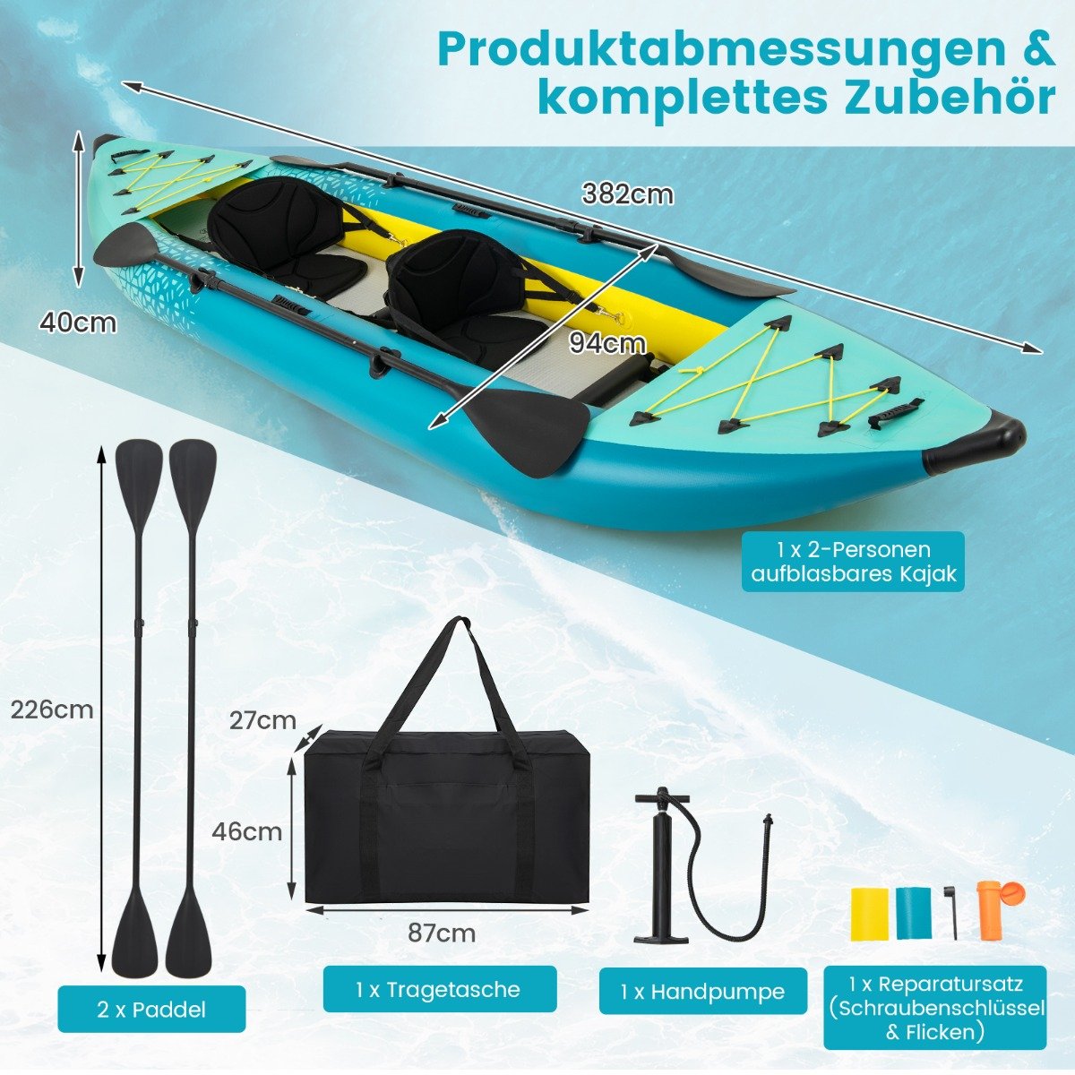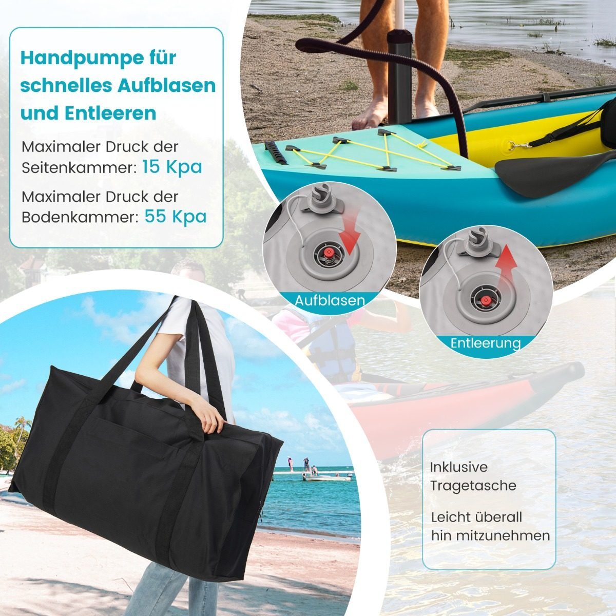 - Praktiški priedai, tokie kaip tvirtinimo dirželiai daiktams, vandens išleidimo anga ir taisymo komplektas.