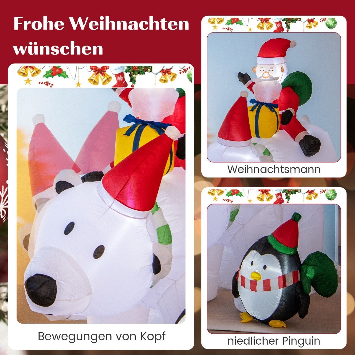 Sukurkite nepamirštamą šventinę nuotaiką su mūsų įspūdingu, 210 cm aukščio pripučiamu dekoru! Šis unikalus Kalėdinis personažas taps tikra jūsų šventės puošmena, sukuriantis džiaugsmingą ir šiltą atmosferą.