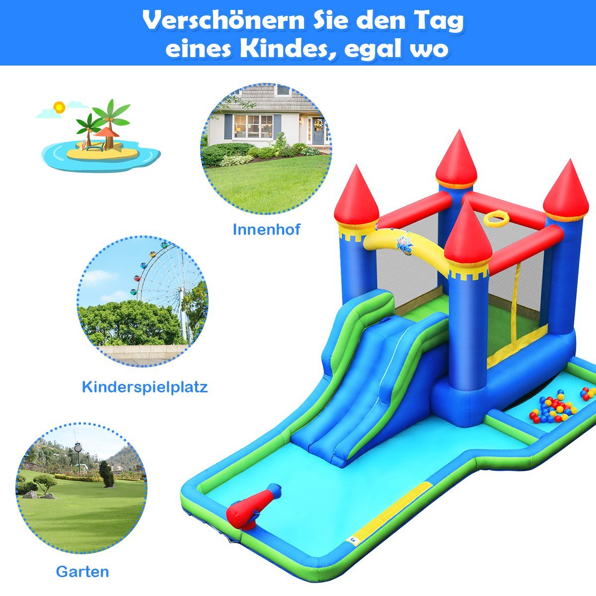 Vasaros karščiams malšinti – šis įspūdingas pripučiamas vandens parkas sukurtas Jūsų vaikams! Jame netrūksta pramogų: nuo linksmo čiuožinėjimo ir šokinėjimo iki žaidimų vandens baseinėlyje bei krepšinio metimo.