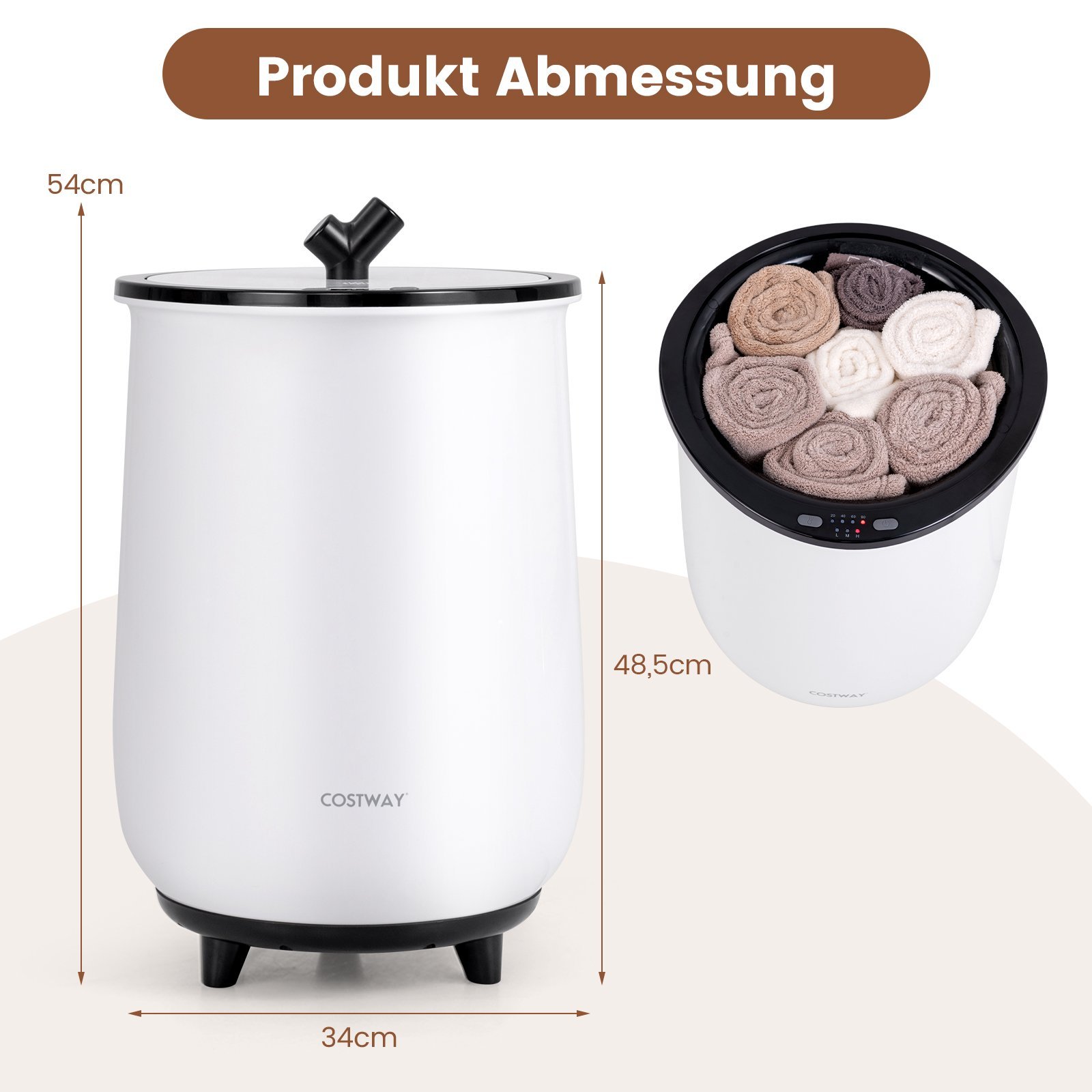 Pakelkite savo vonios kambario patirtį į visiškai naują komforto lygį! Erdvi 23 litrų talpa ir greitas įkaitimas vos per 1 minutę leis šiam rankšluosčių šildytuvui išlaikyti Jūsų rankšluosčius, chalatus, pižamas ir kitus tekstilės gaminius šiltus ir jaukius. Be to, į integruotą aromato disko laikiklį galėsite įdėti mėgstamą kvapiąją tabletę ir mėgautis maloniai kvepiančiais rankšluosčiais. Su 20, 40, 60 ir 90 minučių laikmačio funkcija bei 3 skirtingais temperatūros režimais (žema, vidutinė, aukšta), šis šildytuvas siūlo visiškai pritaikomą šilumą Jūsų poreikiams.