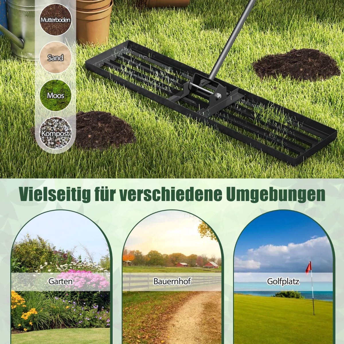 Užtikrinkite nepriekaištingai lygią ir estetišką veją su mūsų profesionaliu sodo lyginimo grėbliu. Sukurtas efektyviam darbui, šis įrankis leis lengvai išlyginti dirvą, pašalinti akmenis ir pagerinti jūsų vejos išvaizdą.