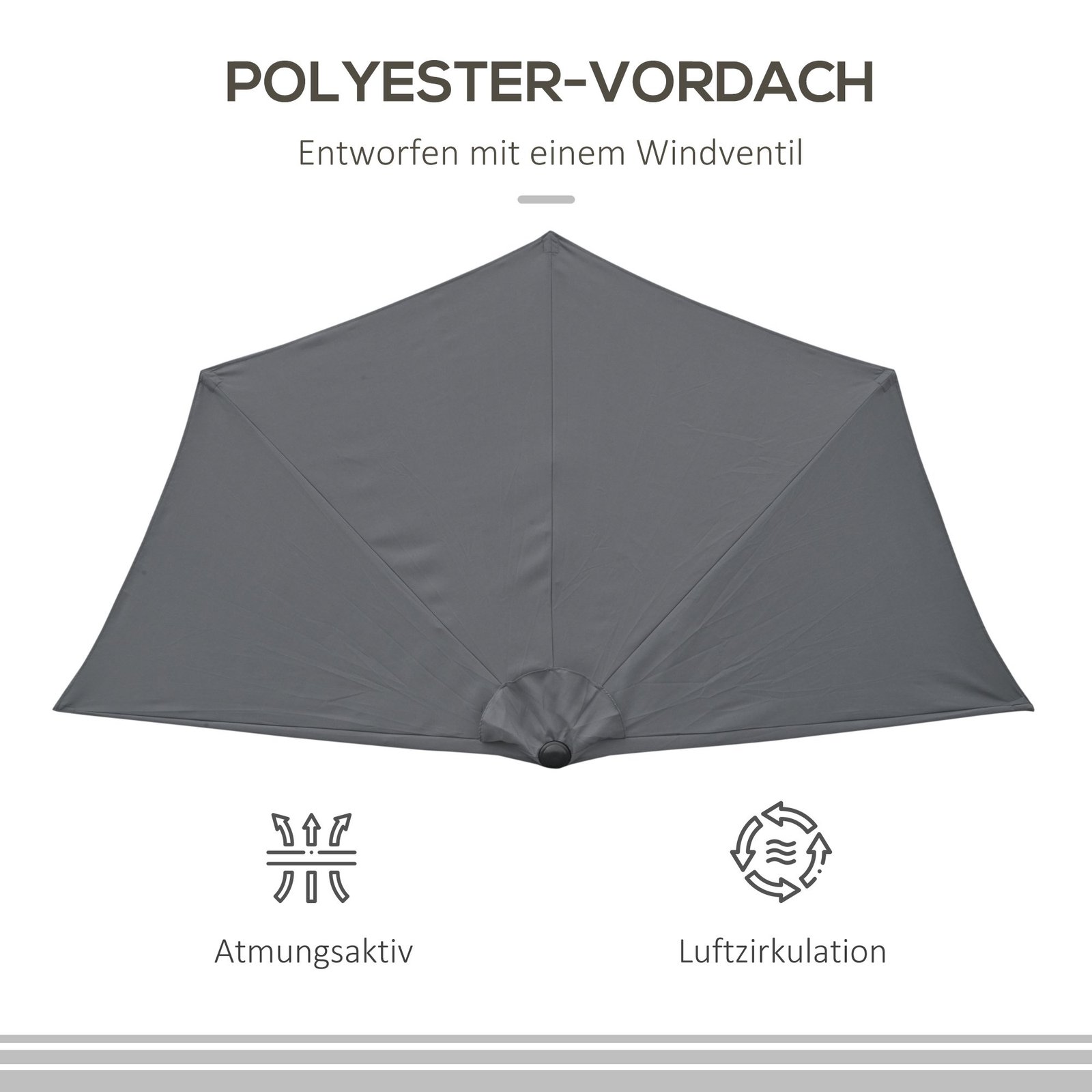✔ Pusapvalės formos dėka skėtis gali būti pastatytas tiesiai prie sienos