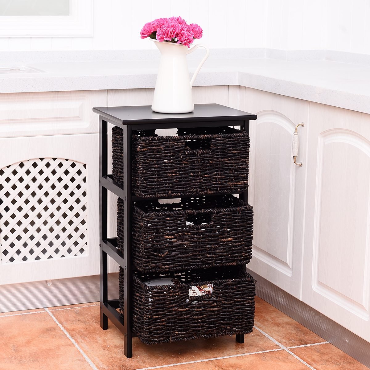 - Aukštos kokybės medžiagos: Komoda pagaminta iš stabilios ir tvirtos pušies medienos, o krepšeliai – iš natūralių ir lanksčių kukurūzų lukštų.