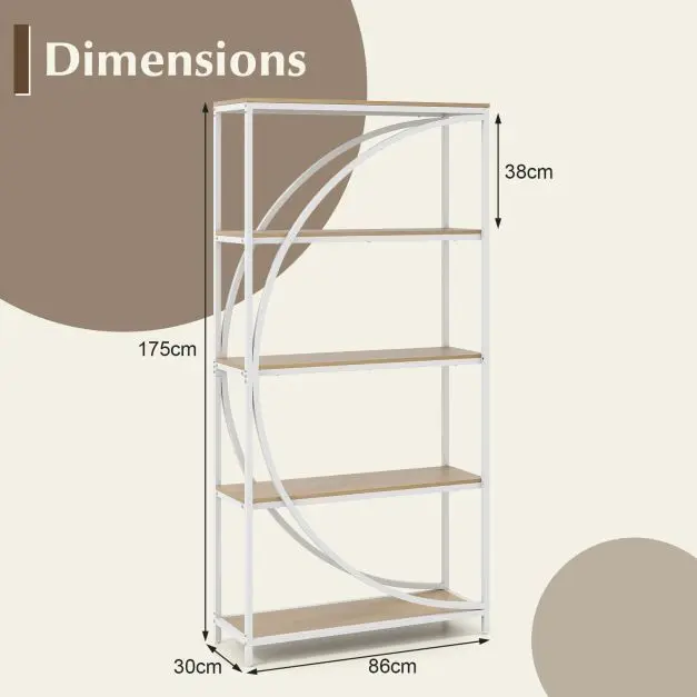 Pusmėnulio formos 5 aukštų knygų lentyna su atviromis lentynomis ir metaliniu rėmu (Natūrali)