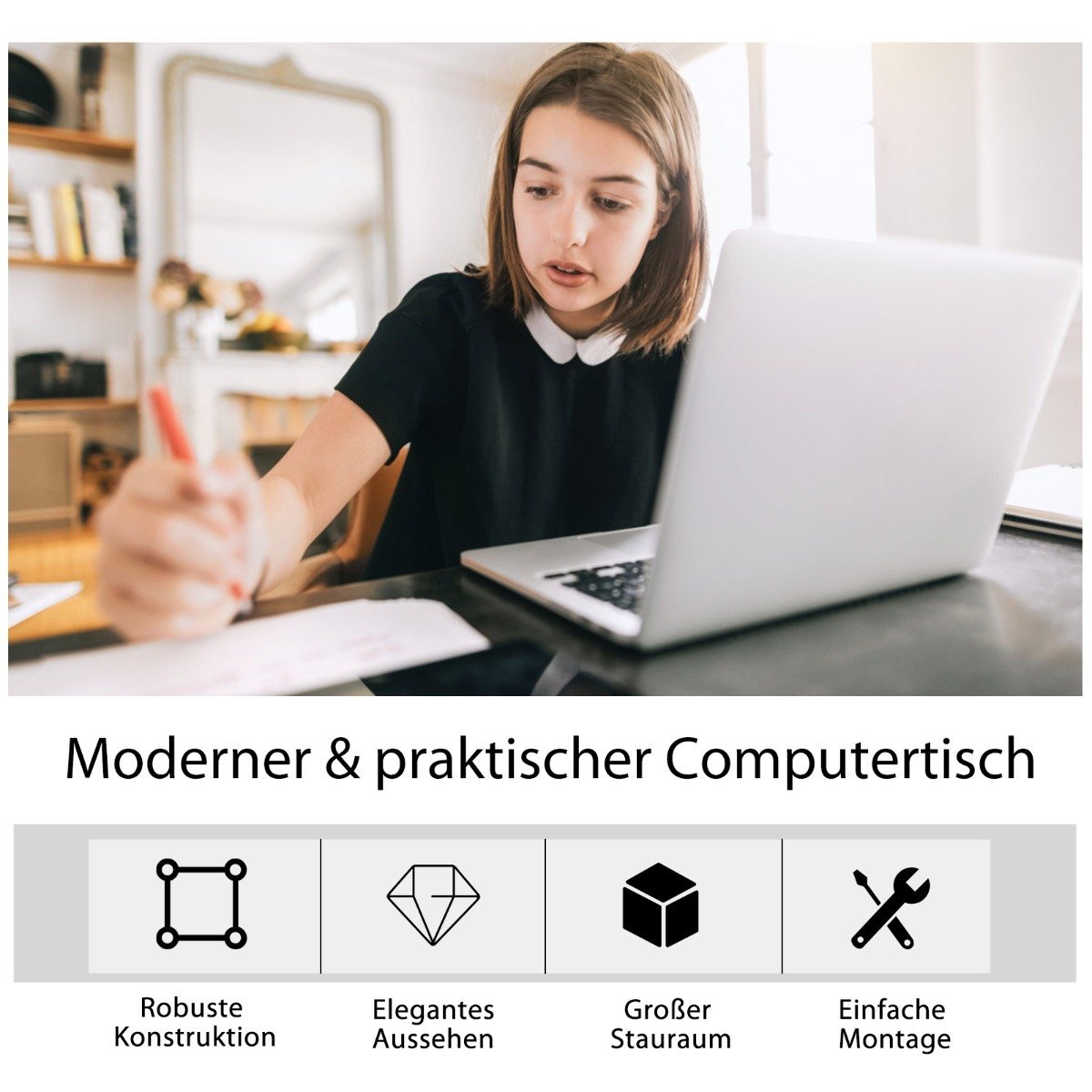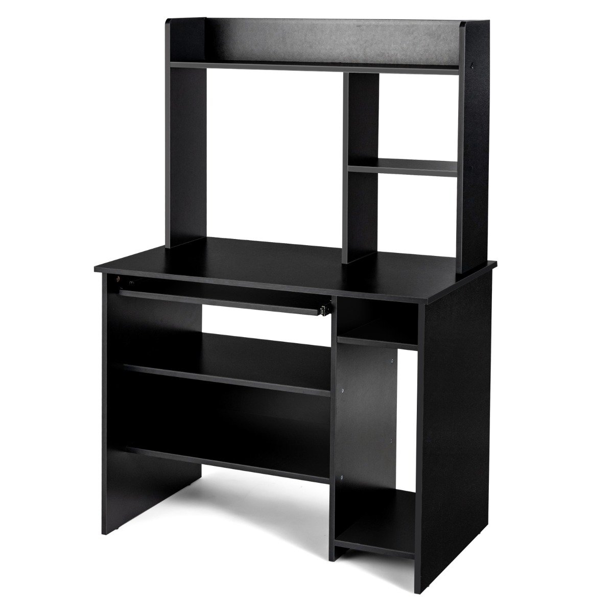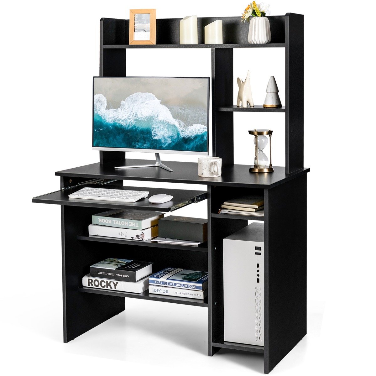 Rašomasis stalas su integruota lentynų sistema ir ištraukiama klaviatūros lentynėle (Juoda)