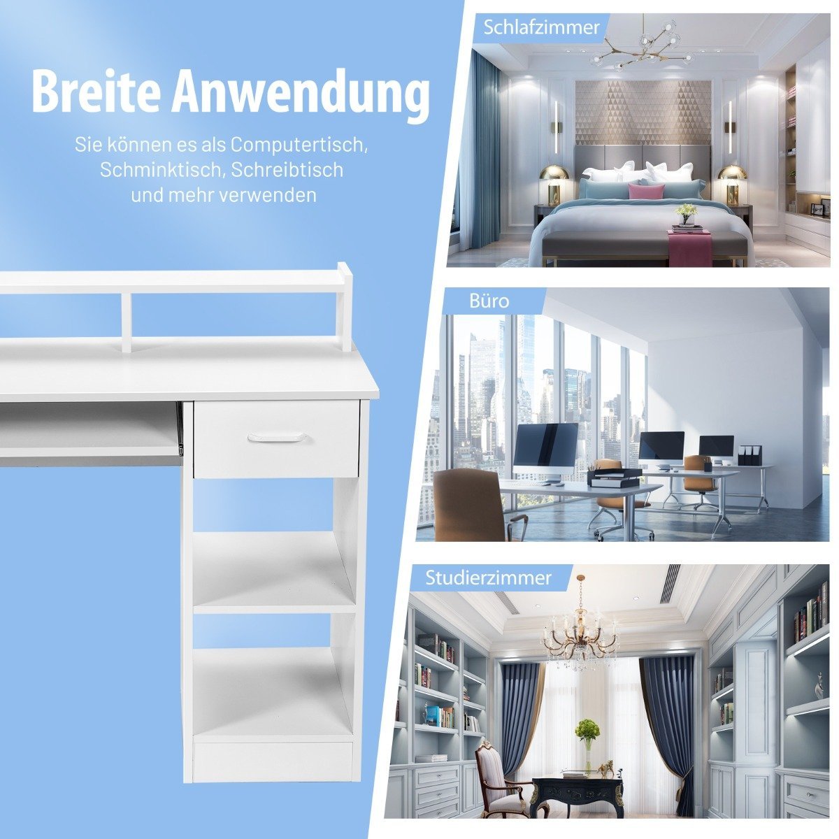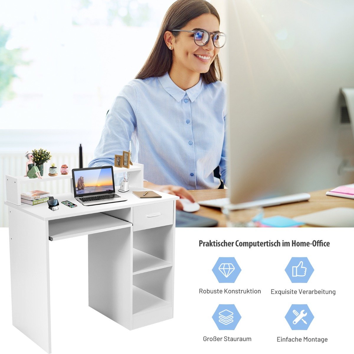 - Praktiškas dizainas su ištraukiama klaviatūros dėkle ir talpiu stalčiumi smulkiems daiktams laikyti.