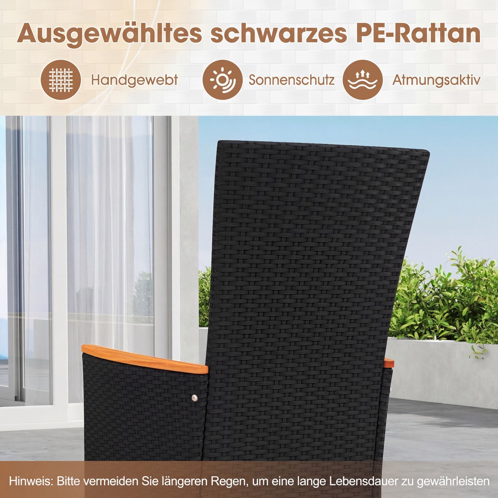- Aukštos kokybės PE ratanas: atsparus saulės spinduliams, išlaiko spalvą ir praleidžia orą.