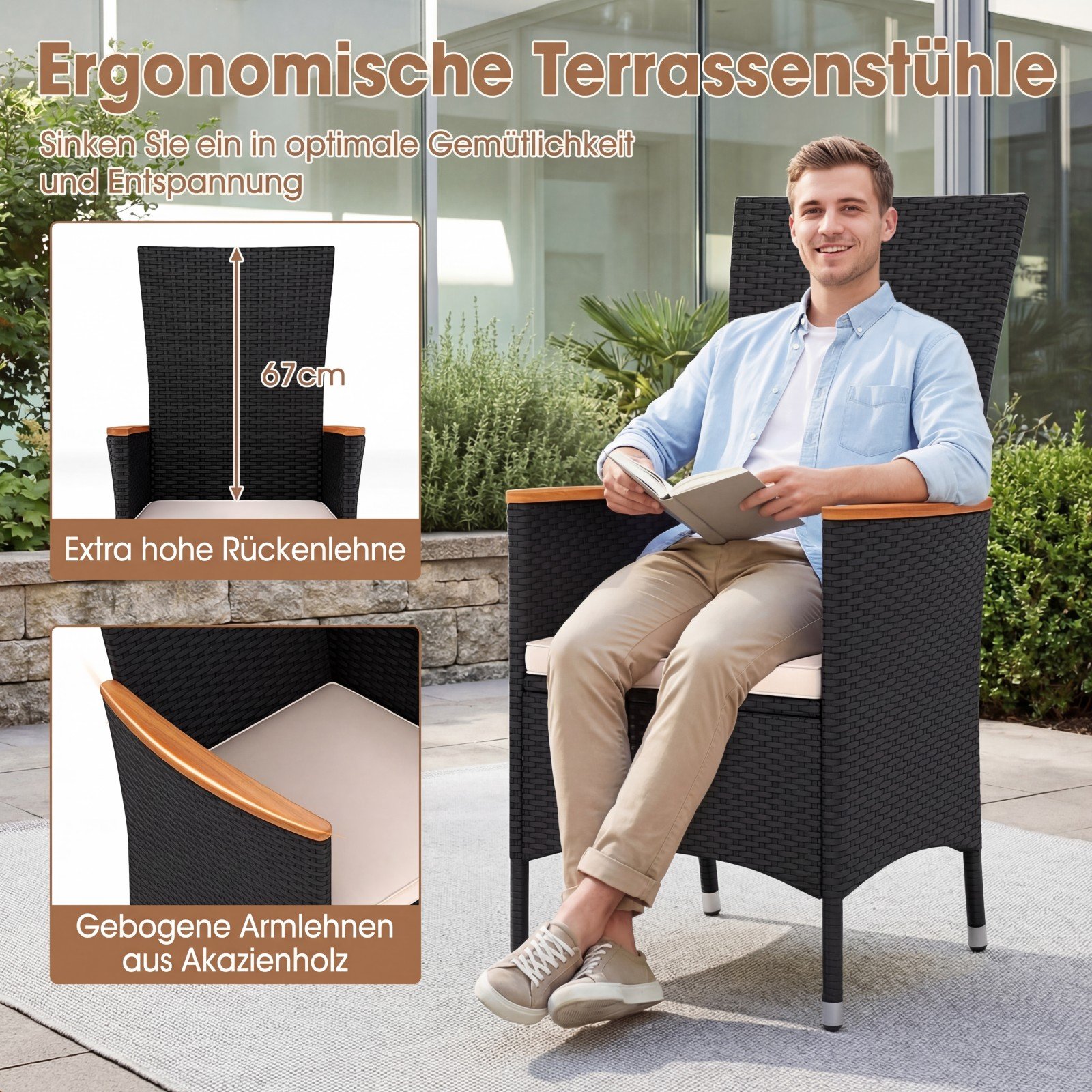 Mėgaukitės stilingomis ir atpalaiduojančiomis akimirkomis lauke su šiais sodo krėslais. Rankomis pintas PE ratanas yra atsparus saulės spinduliams, išlaiko spalvą ir praleidžia orą, todėl idealiai tinka naudoti balkone, terasoje, sode ar prie baseino. Kiekviename krėsle rasite minkštą ir elastingą sėdimąją pagalvėlę, o 67 cm aukščio atlošas ir išlenkti akacijos medienos porankiai užtikrins maksimalų komfortą.