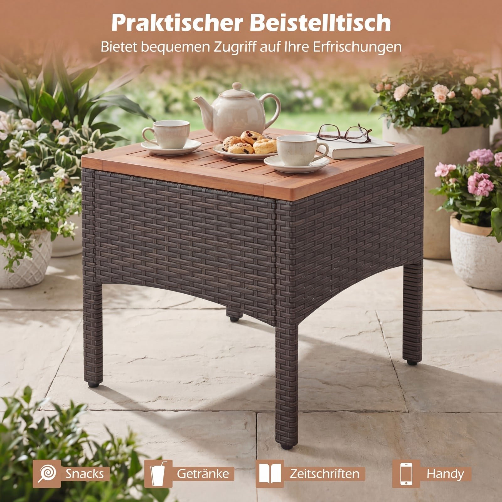 - Ilgaamžė medžiagų kombinacija: rankomis pintas PE ratanas ir tvirta akacijos mediena.