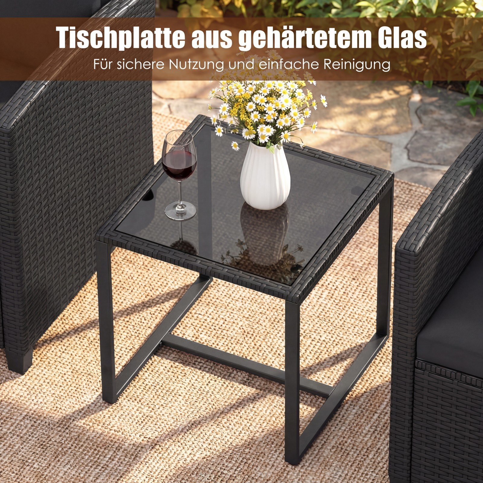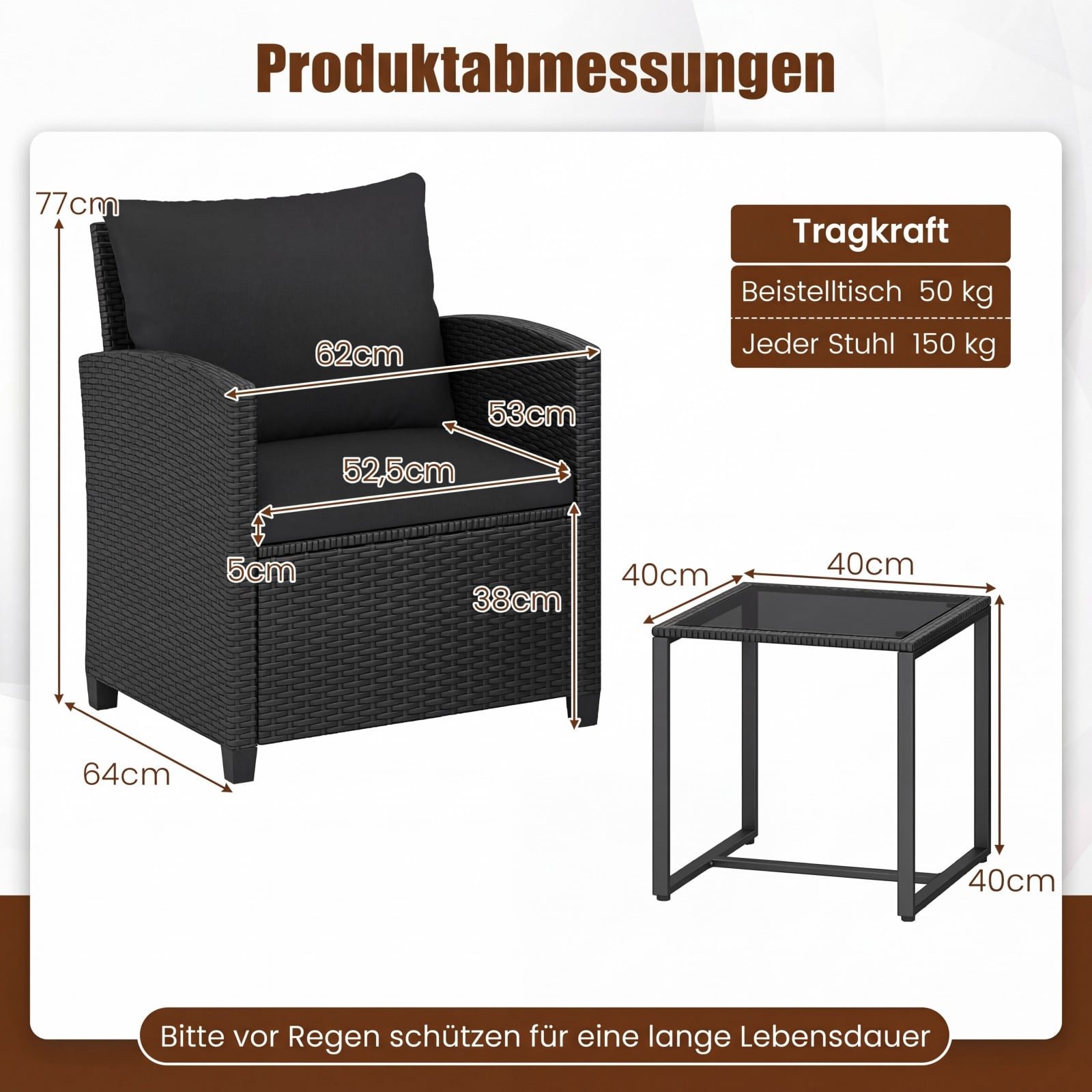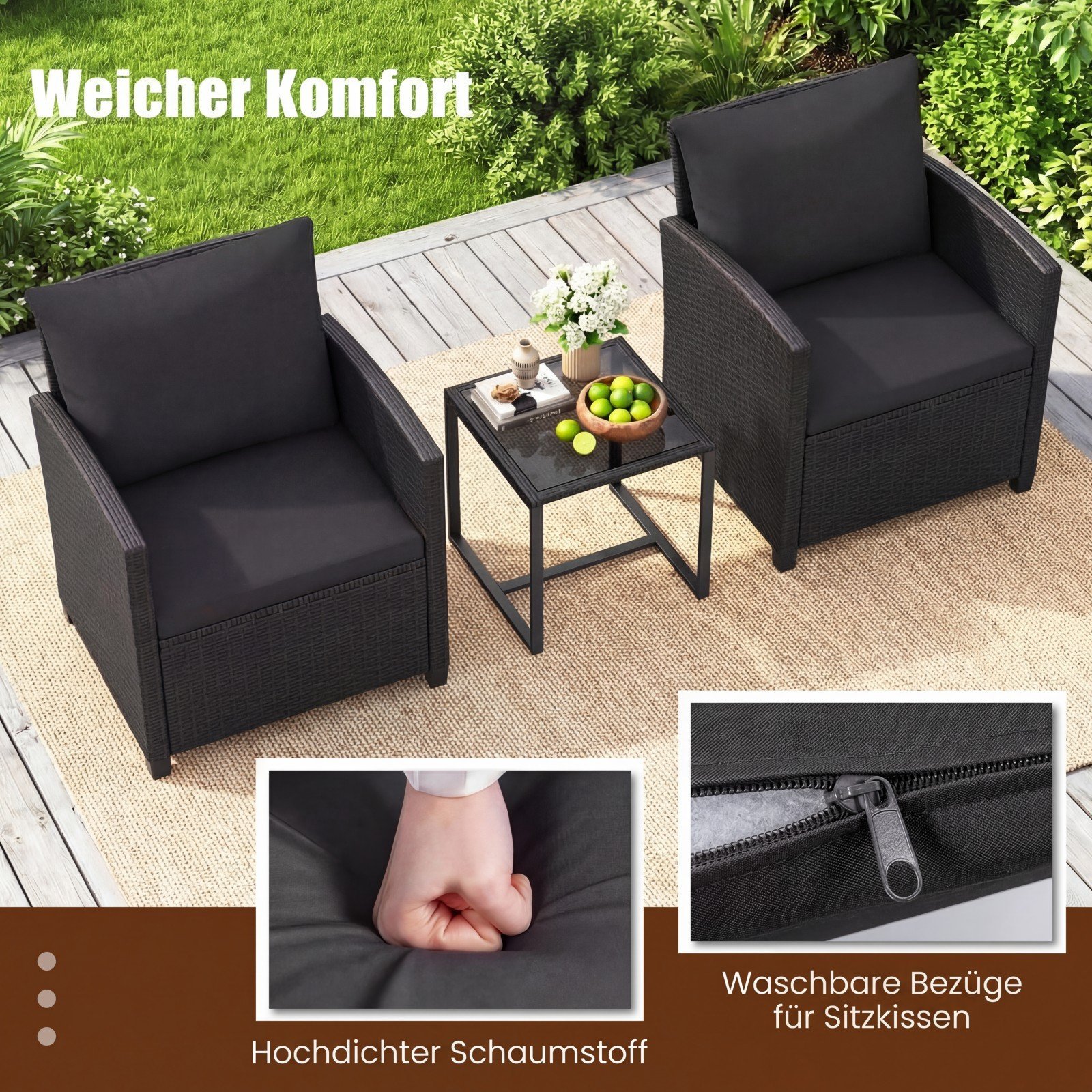 Rataninis lauko baldų komplektas su 2 kėdėmis ir stiklo staliuku (Juoda)