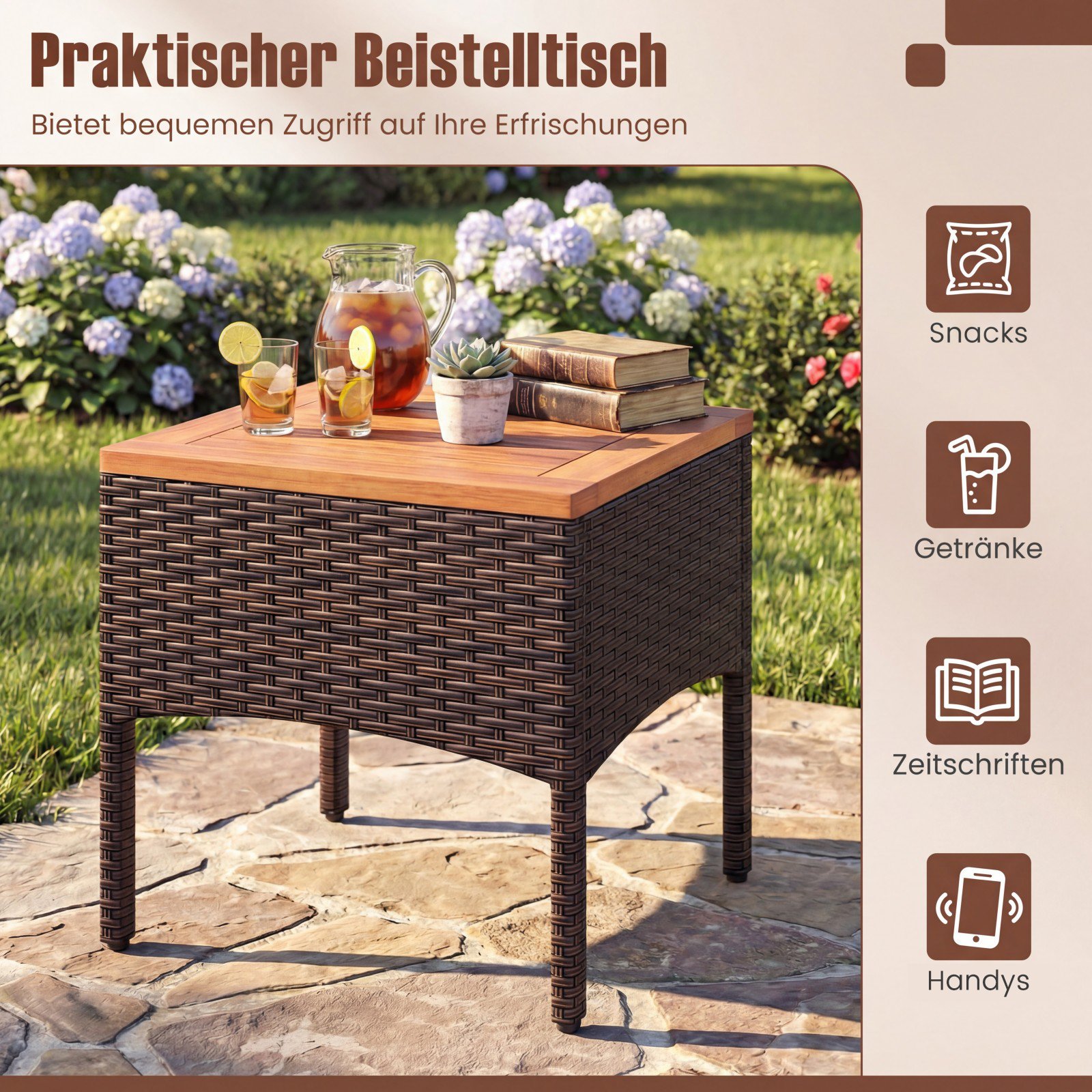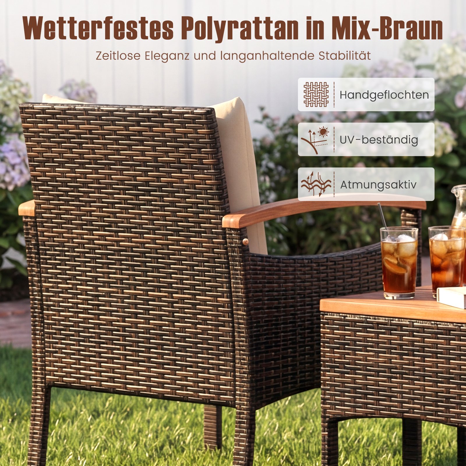 • Aukščiausios kokybės, rankomis pintas PE ratanas ir natūralios akacijos medienos detalės.