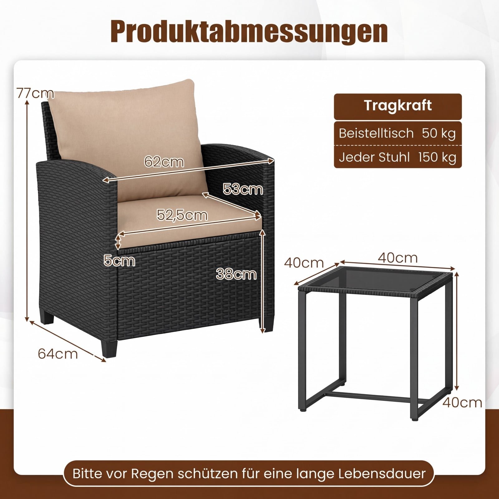 Šis 3 dalių lauko baldų komplektas – puikus pasirinkimas norintiems sukurti jaukią ir funkcionalią poilsio zoną. Pagamintas iš aukštos kokybės PE ratano ir tvirto metalinio rėmo, jis pasižymi dideliu atsparumu įvairioms oro sąlygoms ir ilgaamžiškumu. Komplektą sudaro du patogūs krėslai su minkštomis pagalvėlėmis ir elegantiškas staliukas su grūdinto stiklo stalviršiu, idealiai tinkantis ramiam poilsiui balkone, terasoje ar sode.