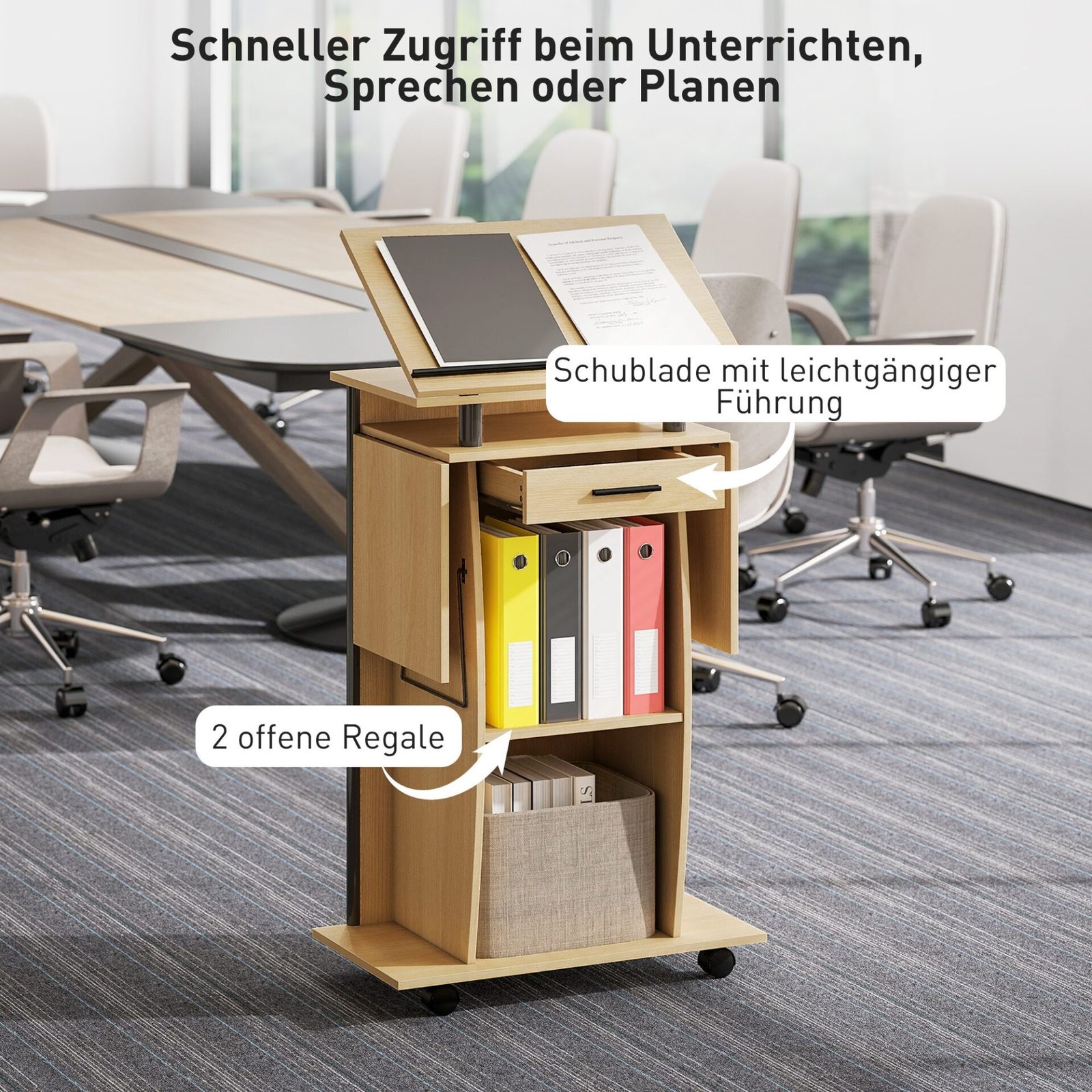 Padarykite savo darbo dieną efektyvesnę su šiuo pristatymo pultu. Idealiai tinka skaityti, piešti ar pristatyti, 7 kryptimis reguliuojamas paviršius optimaliai laiko jūsų nešiojamąjį kompiuterį vietoje. Prireikus praplėskite šoninius paviršius, kad gautumėte daugiau vietos, ir po naudojimo tiesiog juos sulenkite. Integruotos stovimo stalo laikymo vietos užrašams, rašikliams ir įrankiams leidžia viską svarbu laikyti po ranka.