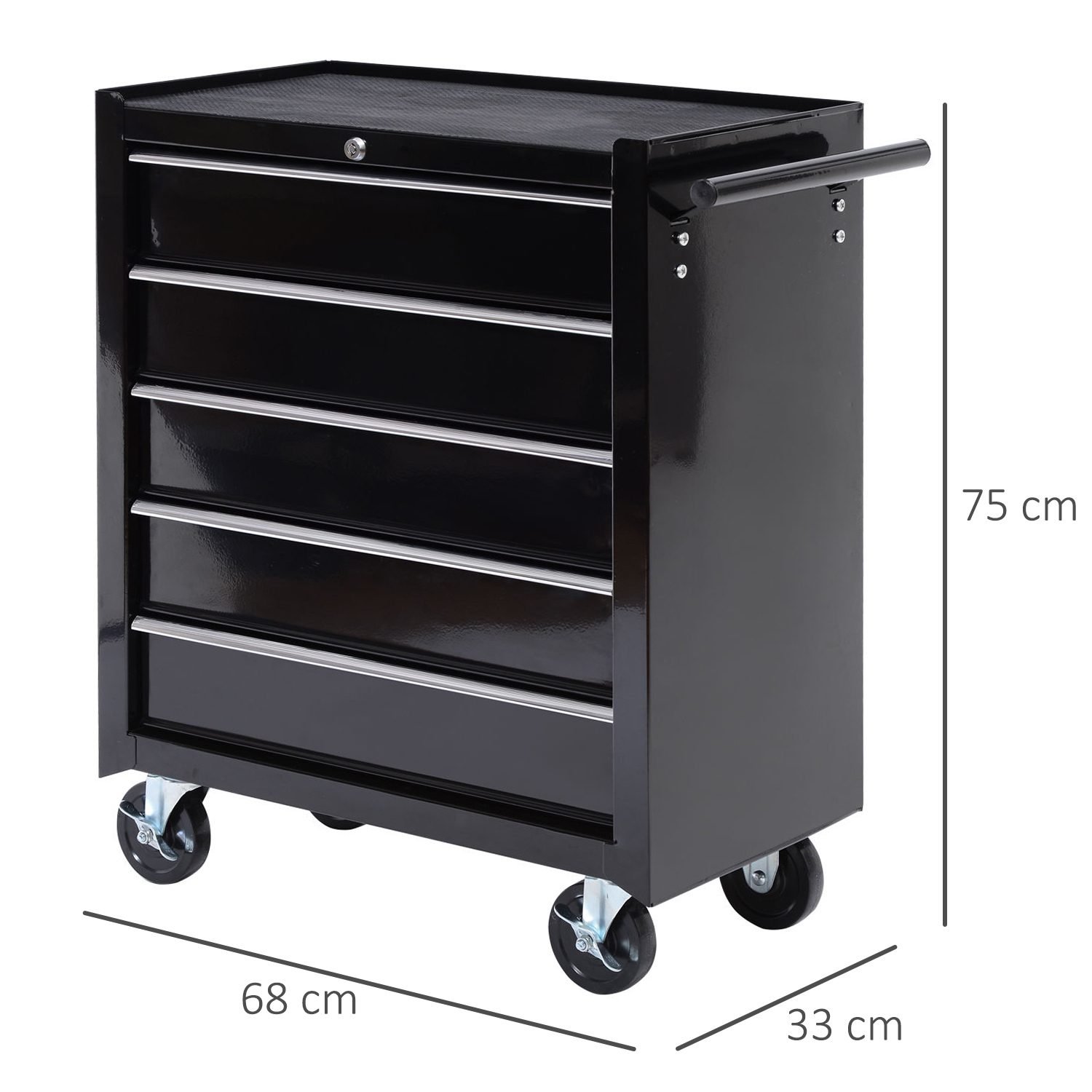 Atraskite šią įrankių dėžę, idealiai tinkančią saugiam jūsų profesionalios įrangos laikymui. Su penkiais stalčiais, kurie suteikia daug organizuotos vietos, greitai rasite reikiamus įrankius. Viršutinis kilimėlis užtikrina papildomą laikymo vietą. Pagaminta iš milteliniu būdu dengto plieno, jos tvirta konstrukcija užtikrina ilgalaikį stabilumą. Keturi ratukai ir šoninė rankena leidžia ją lengvai perkelti. Su spyna ir dviem raktais.