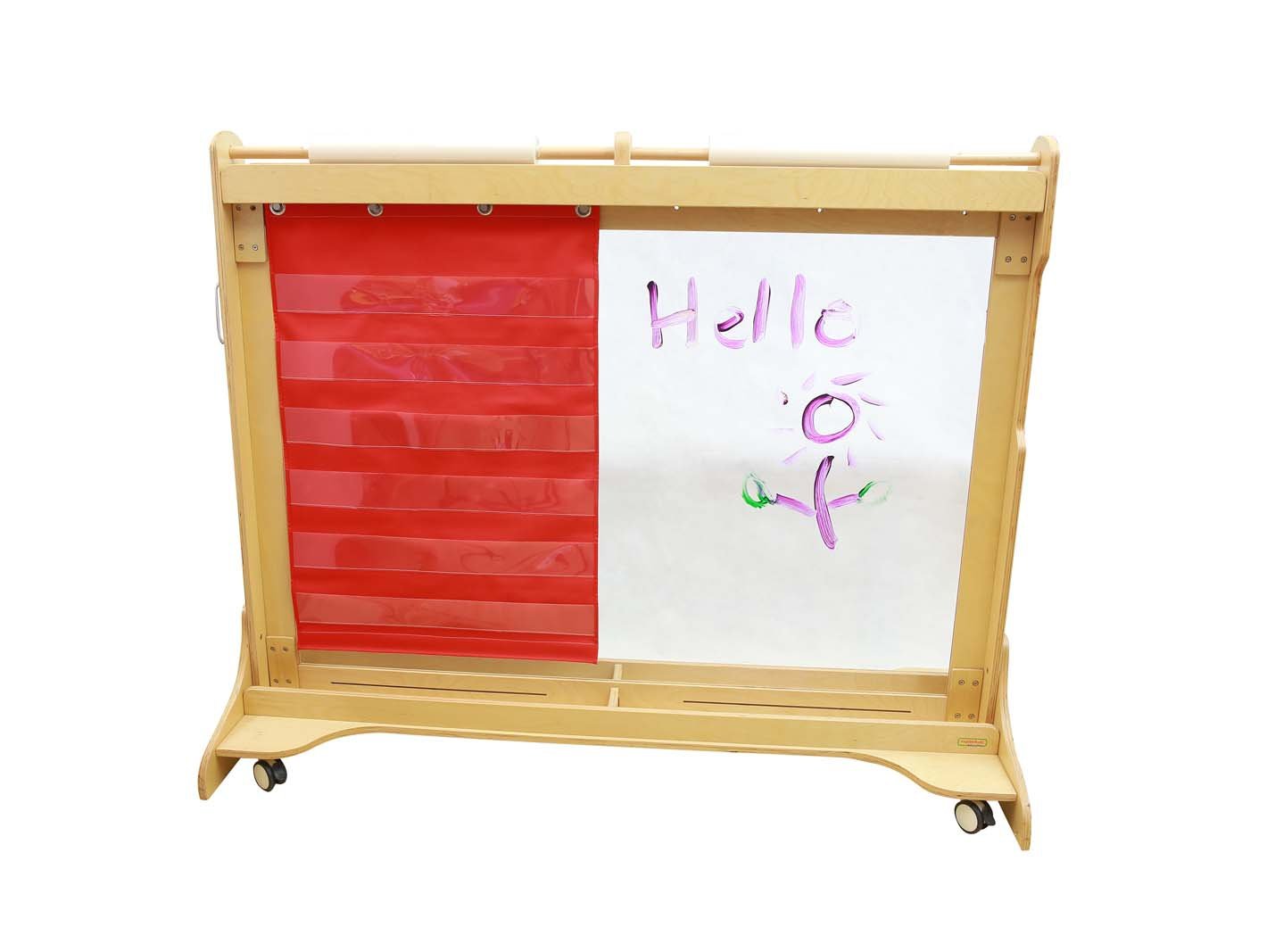 - Dvipusis naudojimas: Kitoje pusėje integruotas paviršius su lipuku (Velcro), prie kurio patogu ir tvarkingai tvirtinti įvairias mokomąsias priemones.