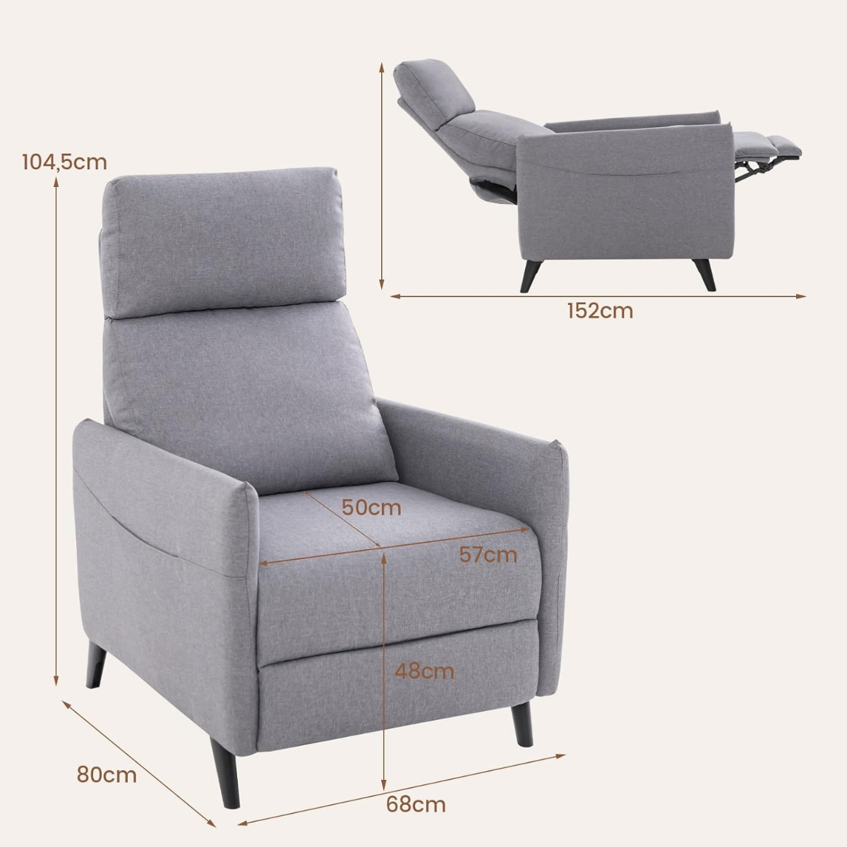 • Matmenys (Sofos režimas): 80 x 68 x 104,5 cm (Ilgis x Plotis x Aukštis)