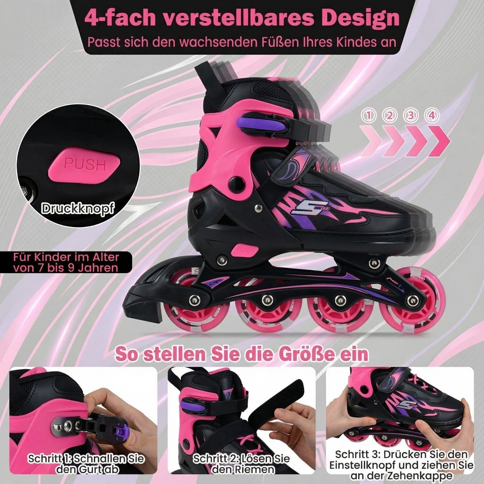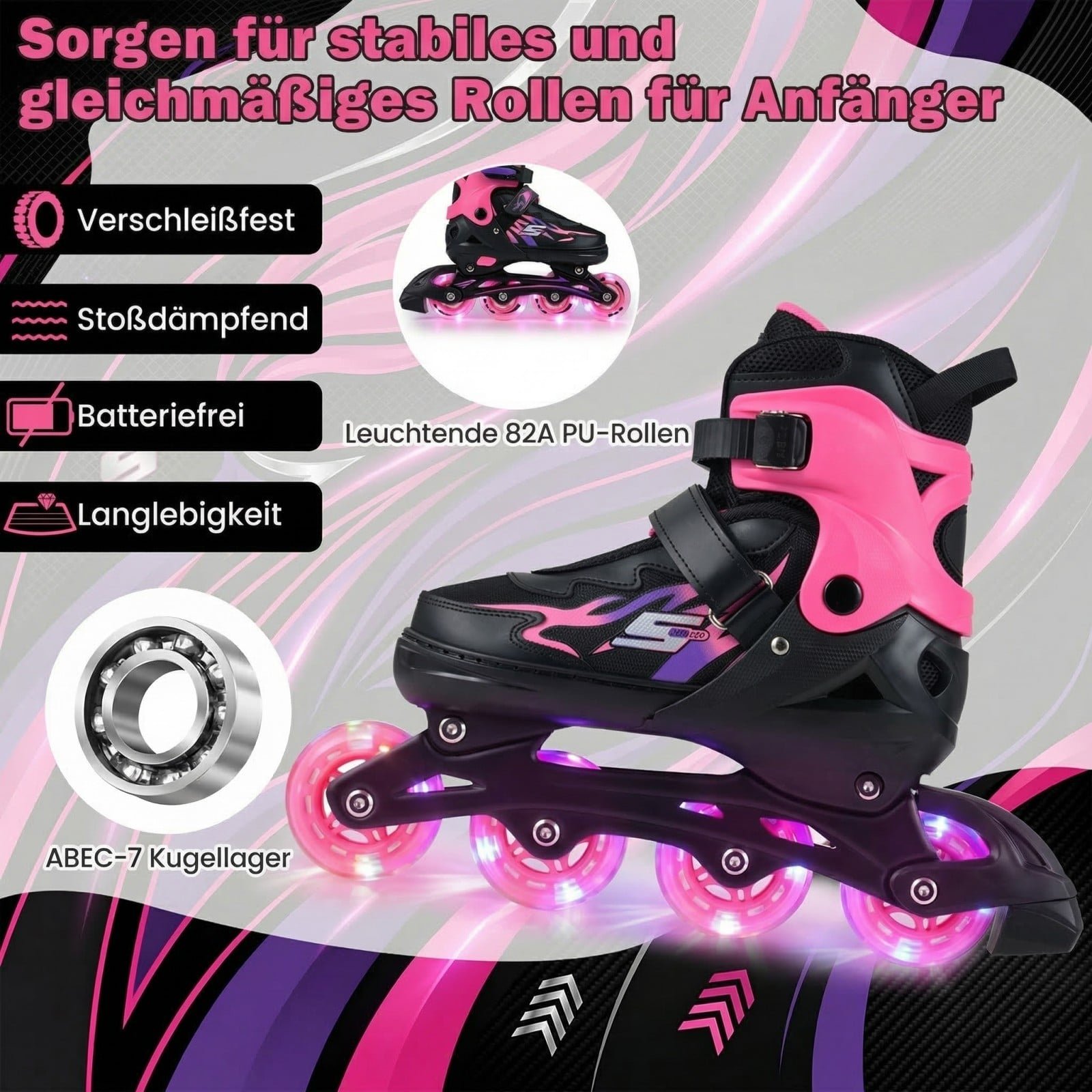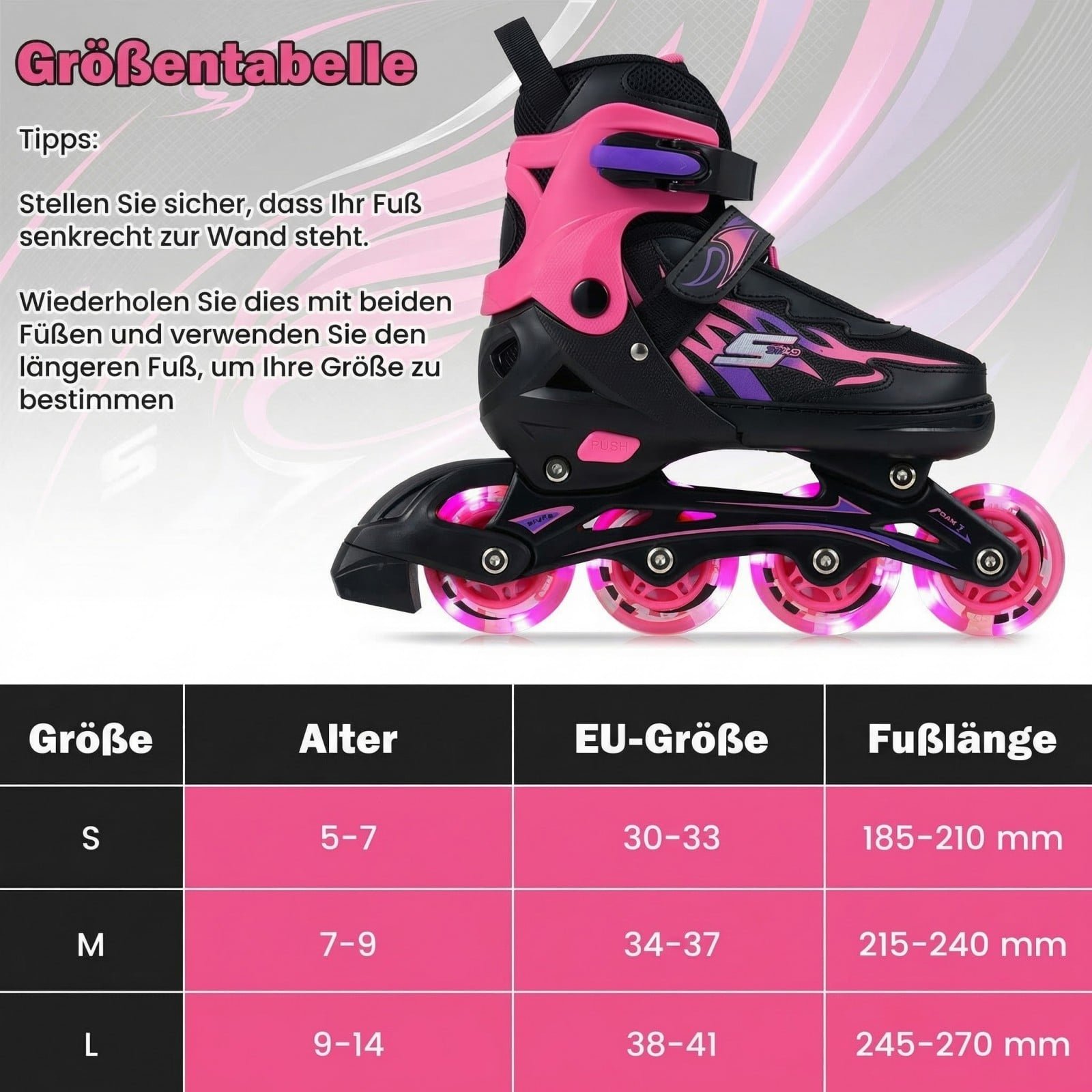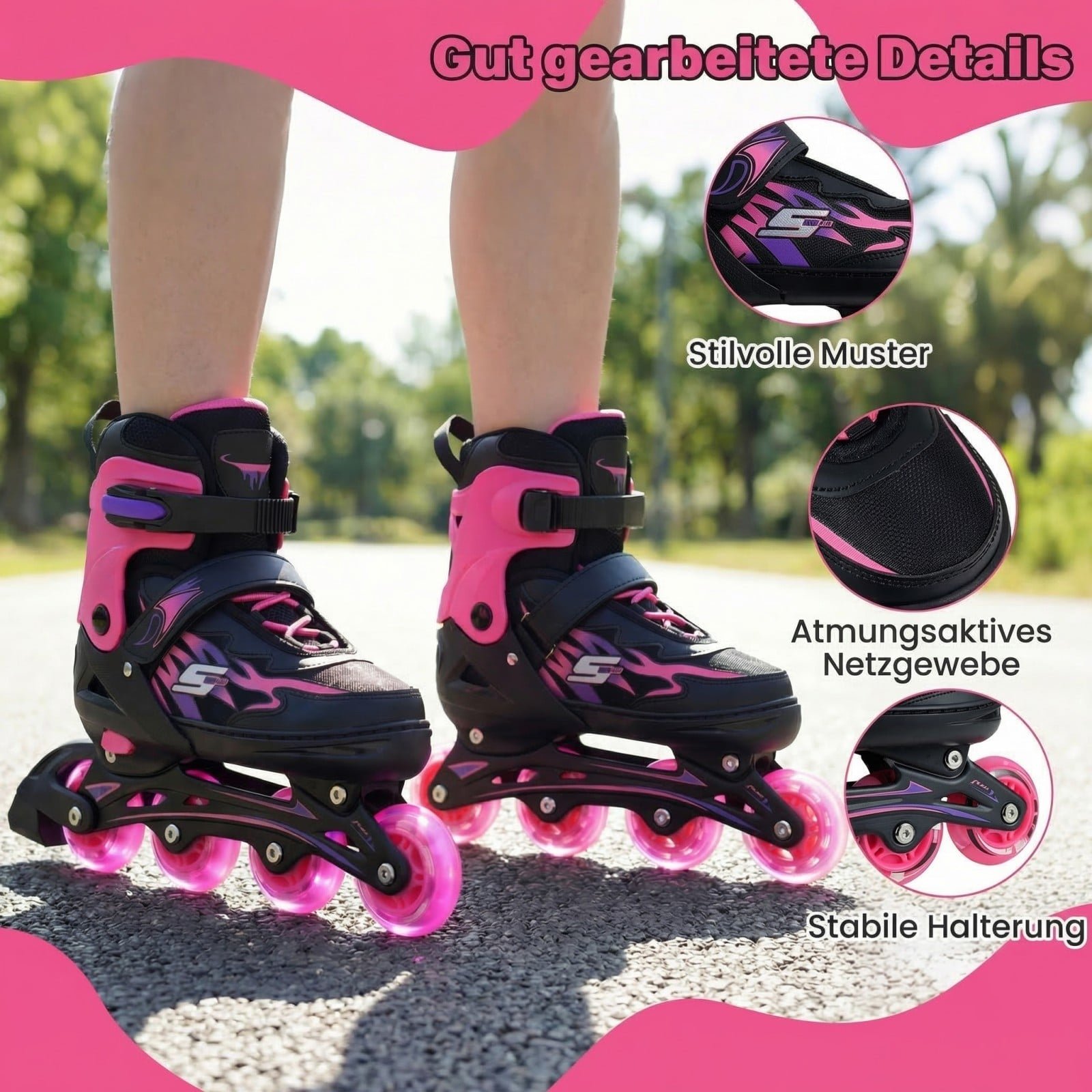 Šie riedučiai, sukurti patogumui ir saugumui, užtikrina smagų ir sklandų riedėjimą. Kvėpuojantis tinklelis ir minkštas pamušalas garantuoja komfortą net ir ilgų pasivažinėjimų metu. Su 4 dydžių reguliavimo sistema riedučiai augs kartu su Jūsų vaiku, o šviečiantys ratai kiekvieną riedėjimą pavers nuotykiu.