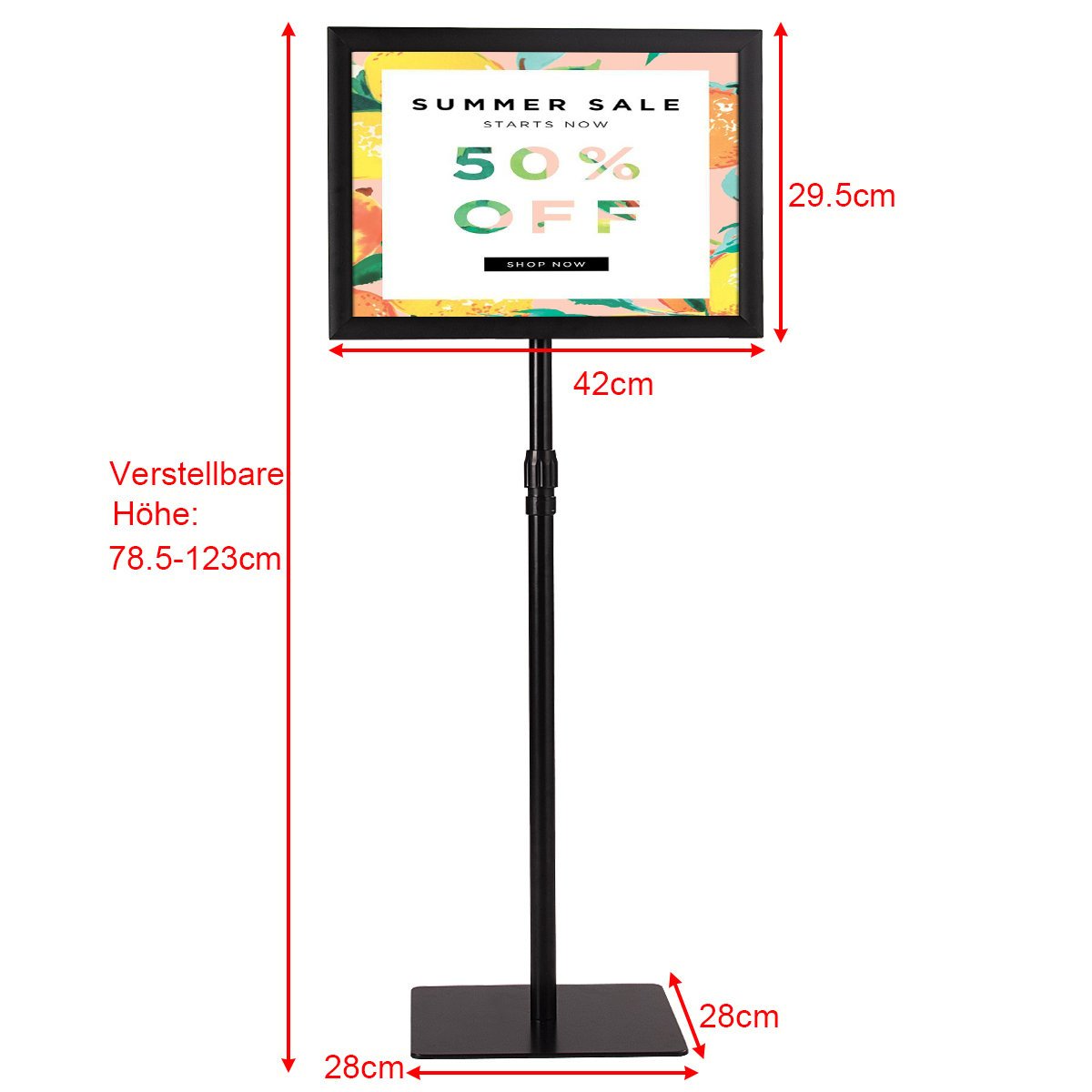 - Reguliuojamas aukštis: Stendo aukštį galima lengvai reguliuoti nuo 78,5 cm iki 123 cm, pritaikant jį prie įvairių aplinkų ir poreikių.