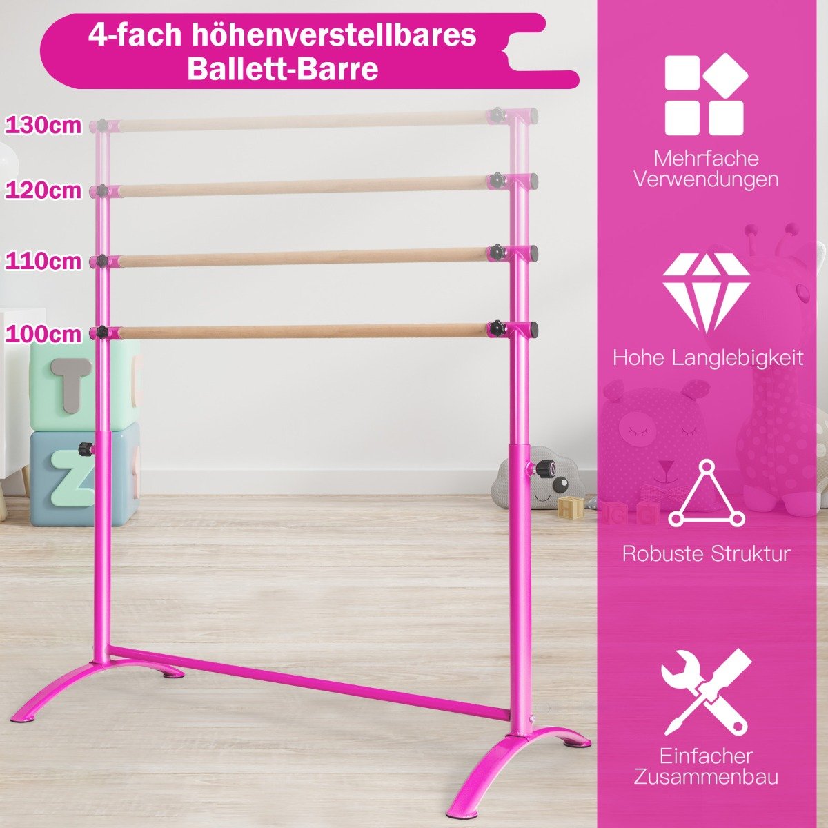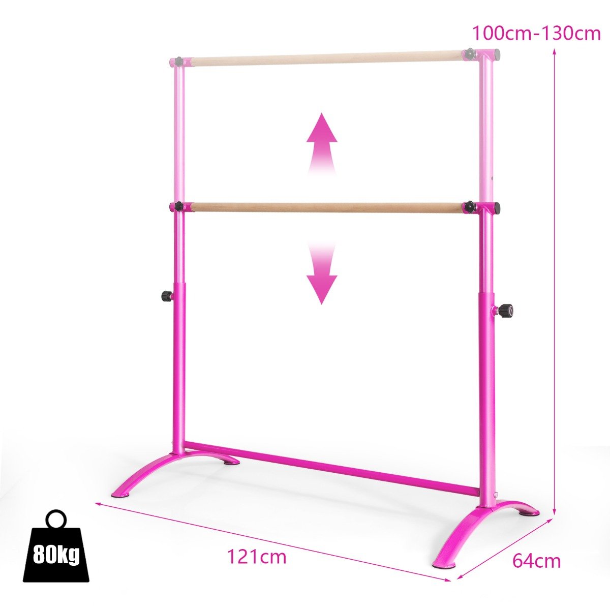 - Reguliuojamas aukštis keturiose pozicijose (100-130 cm) – pritaikomas įvairaus ūgio šokėjams.