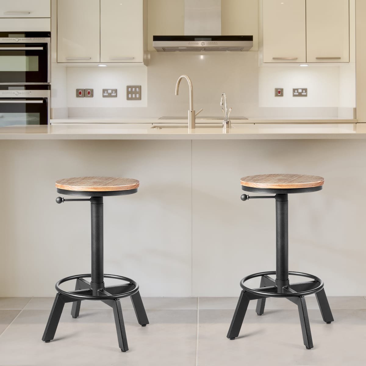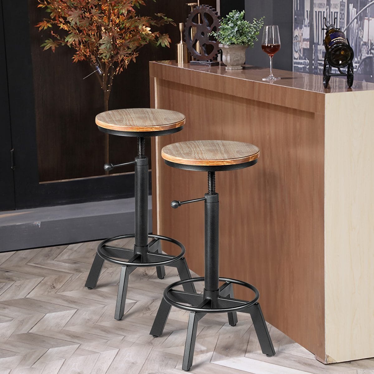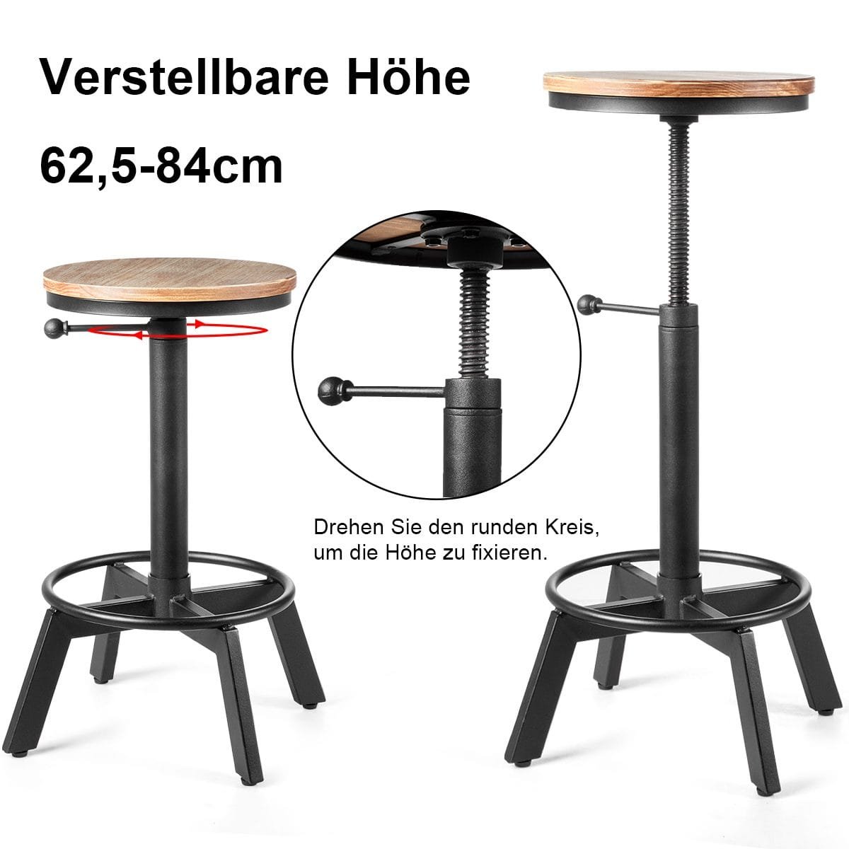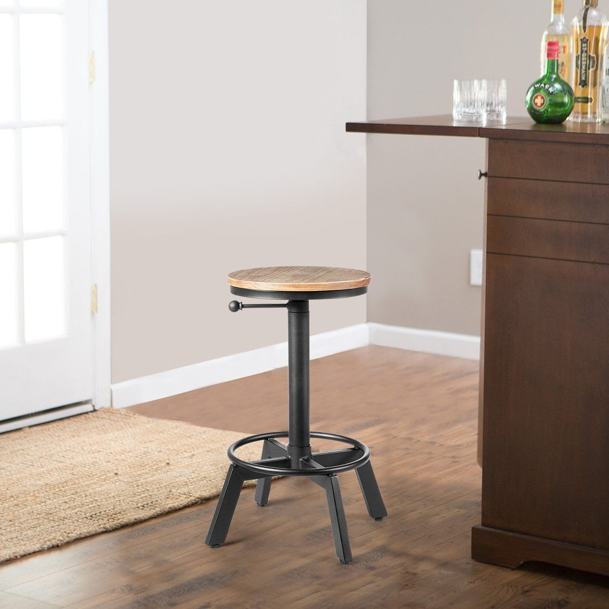 Reguliuojamo aukščio baro kėdė su medžio ir metalo detalėmis ir atrama kojoms (Juoda)