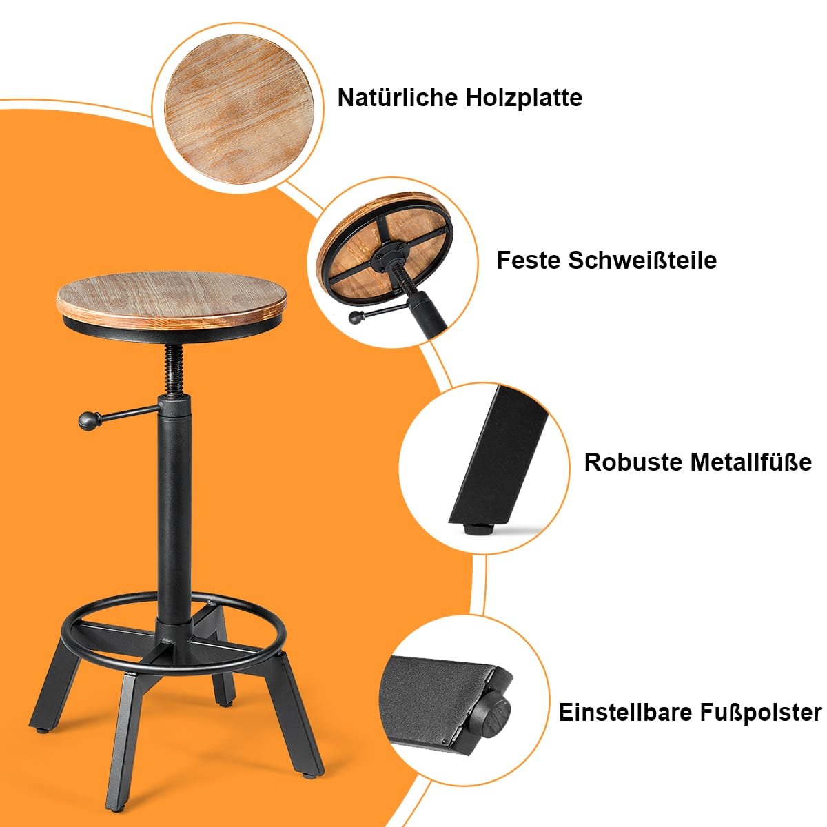 Ši unikalaus industrinio dizaino medinė ir metalinė baro kėdė suteiks išskirtinumo jūsų barui, užeigai ar restoranui! Ji yra patogiai reguliuojamo aukščio, turi pasukamą sėdimąją dalį ir ergonomišką atramą kojoms. Tvirtas geležies rėmas su apsaugine danga ir keturiomis atramomis kojoms užtikrina optimalų stabilumą, nebraižant grindų.