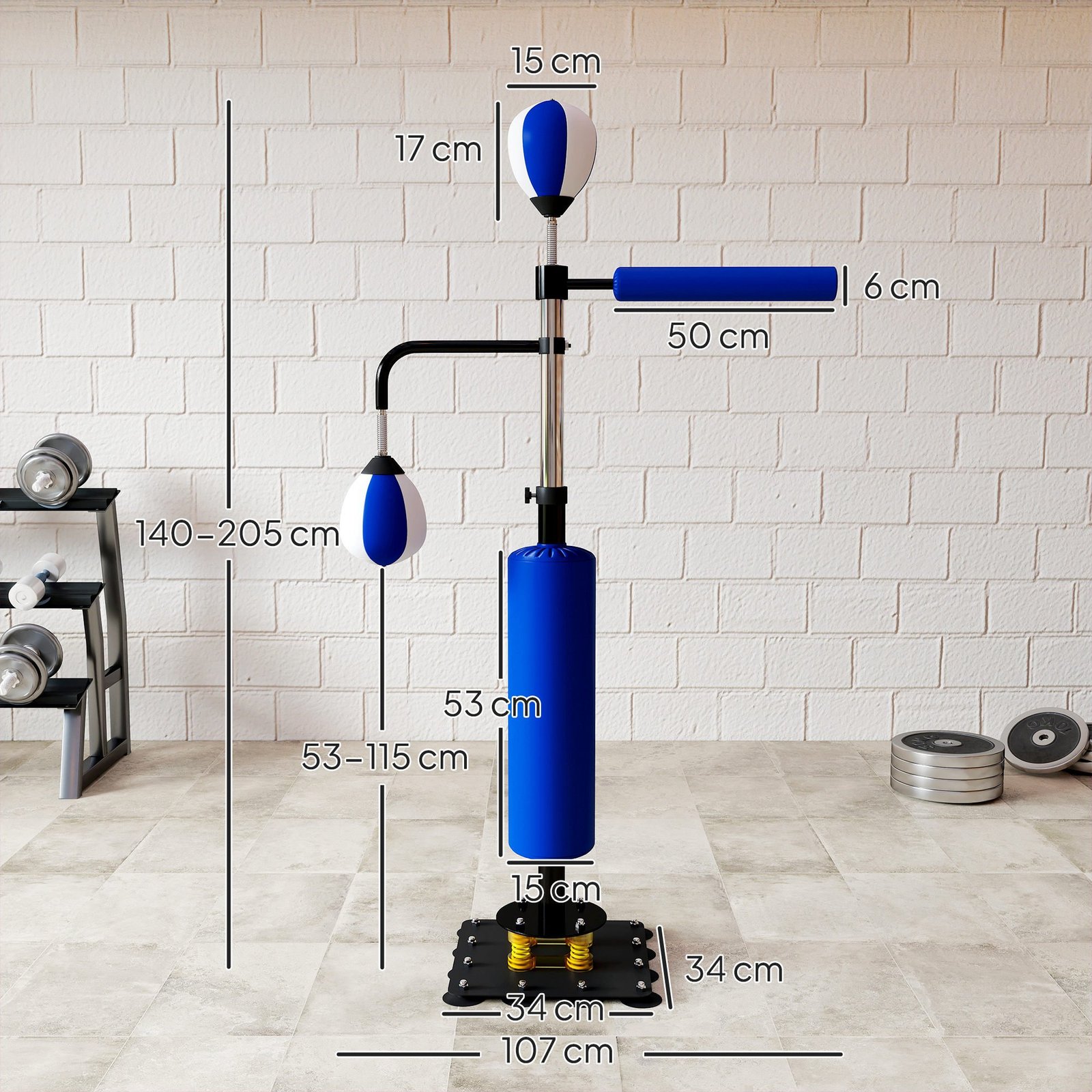 Boksas siūlo efektyvų ir tvarų viso kūno treniruotę, kuri padeda stiprinti kojas, nugarą, krūtinę ir pečius. Todėl sukūrėme šį praktišką stovintį bokso maišą, kad galėtumėte treniruoti savo fizinį pasirengimą, greitį, rankų ir akių koordinaciją bei ištvermę neišeidami iš namų. Naudodamiesi greitais „Speedball“ kamuoliais, laisvai besisukančiu bokso stulpu ir praktišku smūgių pagalvėle, galite palaikyti gerą fizinę formą ir optimaliai pasiruošti ringui.
