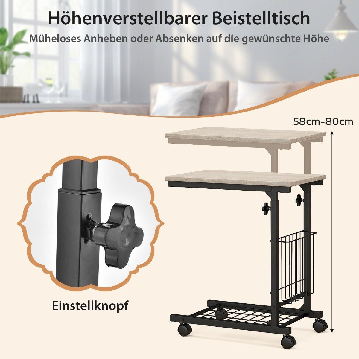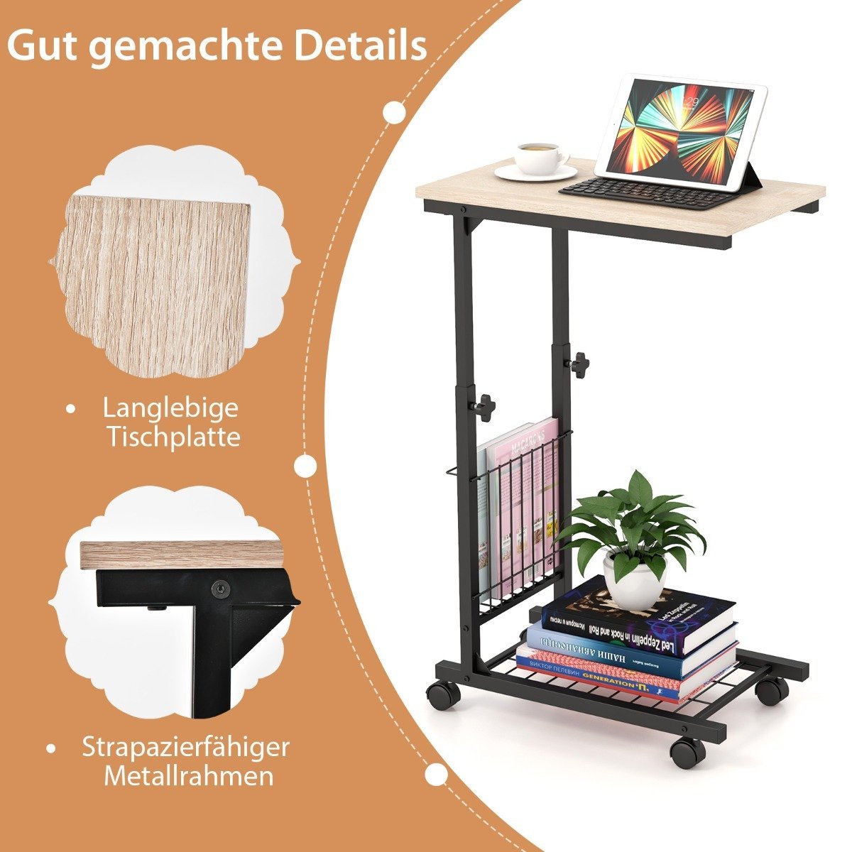 Reguliuojamo aukščio C formos staliukas su ratukais (Natūrali)