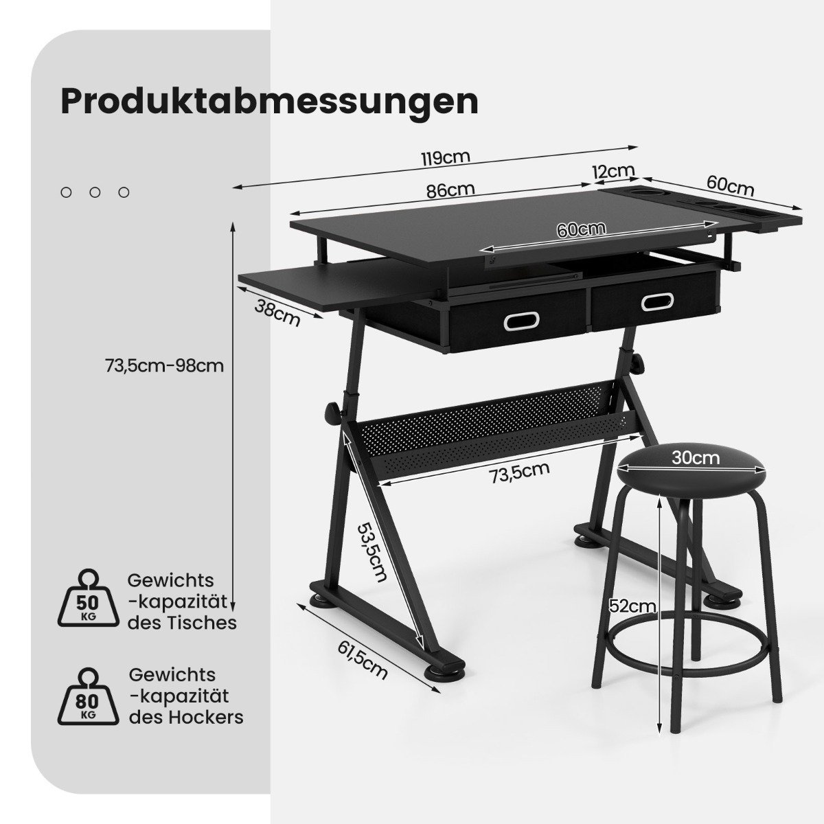 - Maksimali taburetės apkrova: 80 kg