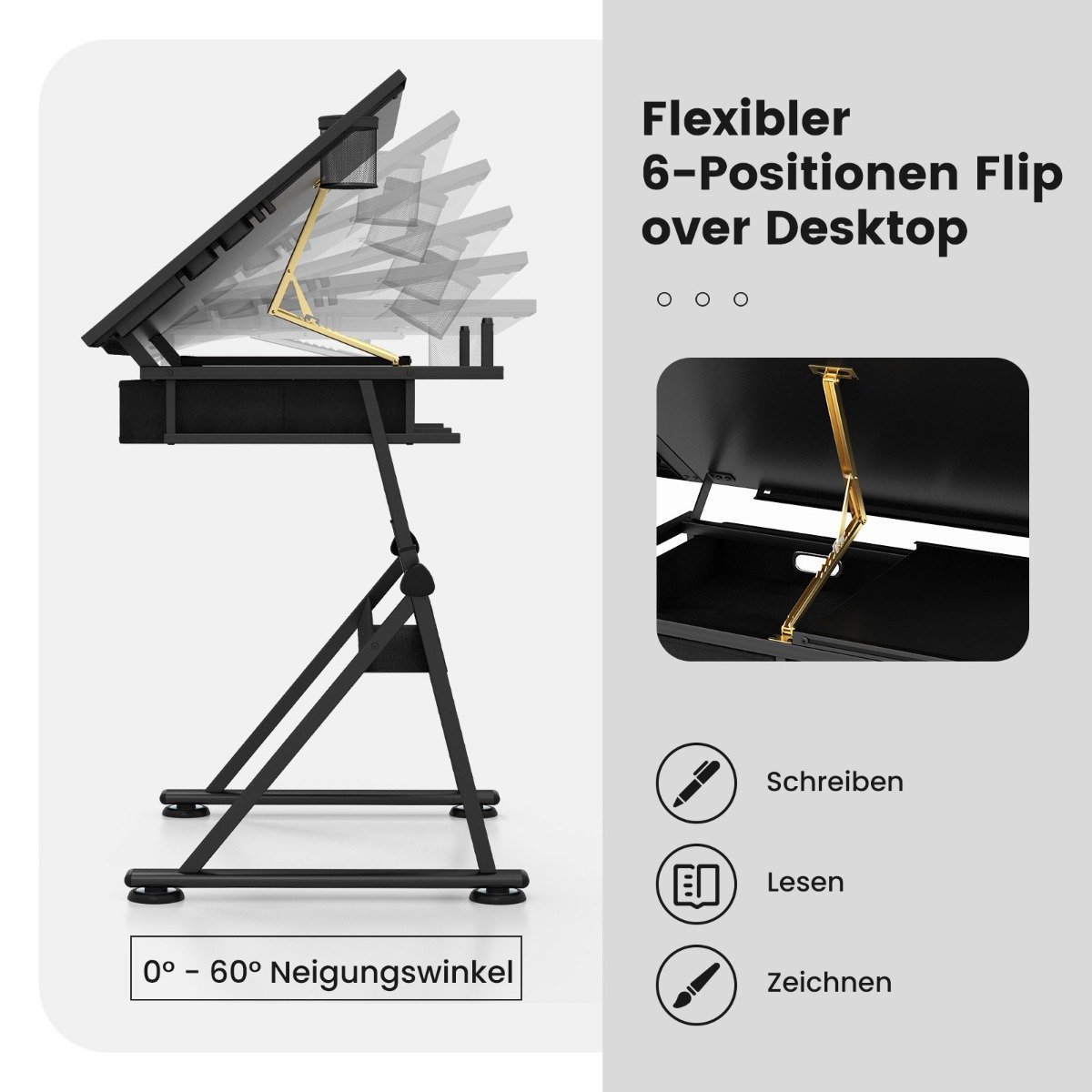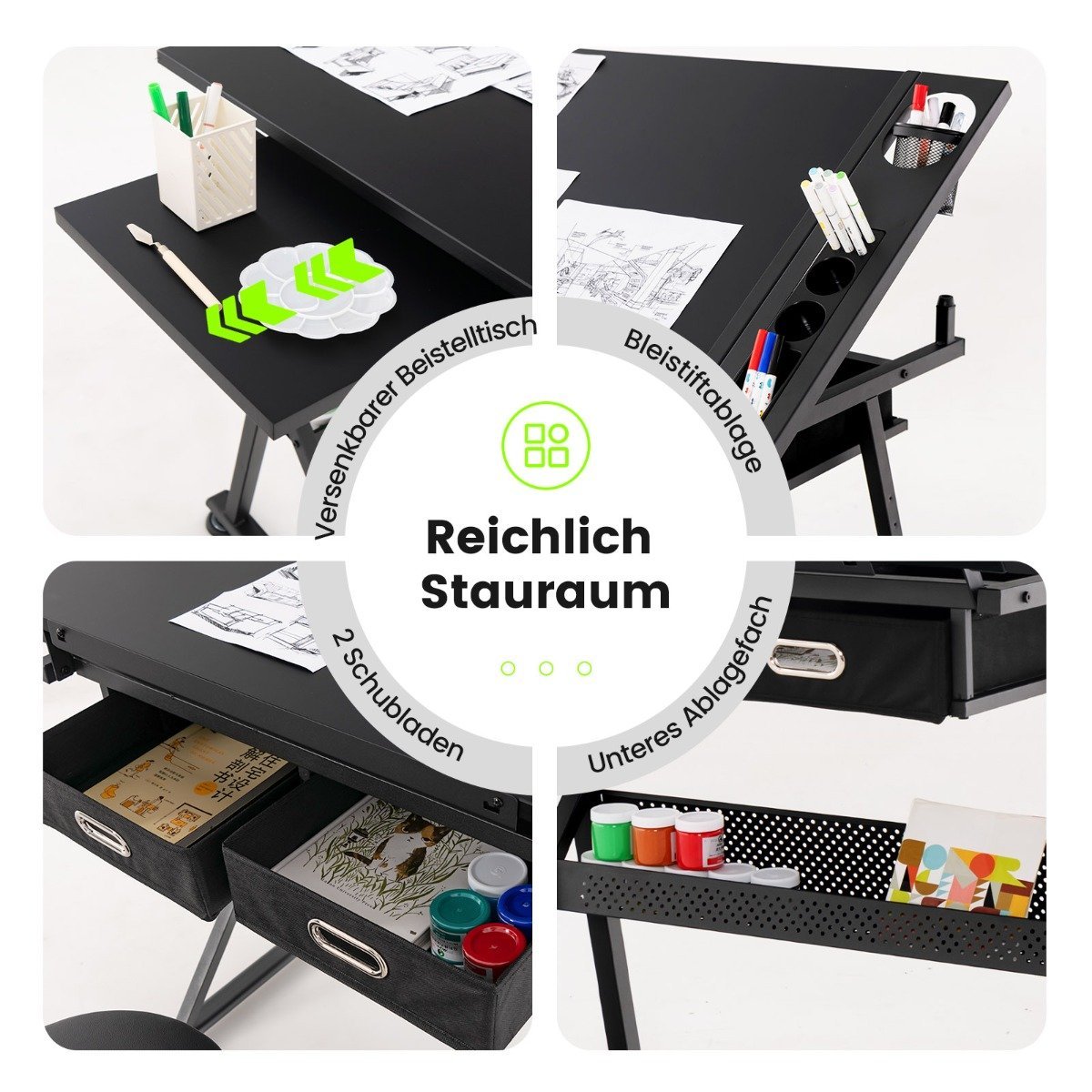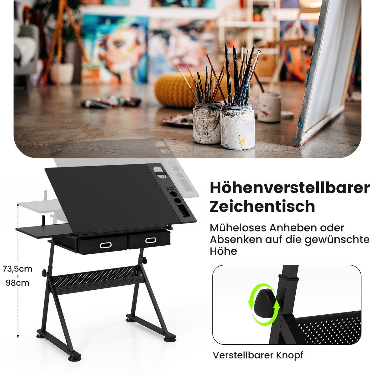 Reguliuojamo aukščio dailės stalas su pakreipiama stalviršio plokšte ir stalčiais (Juoda)