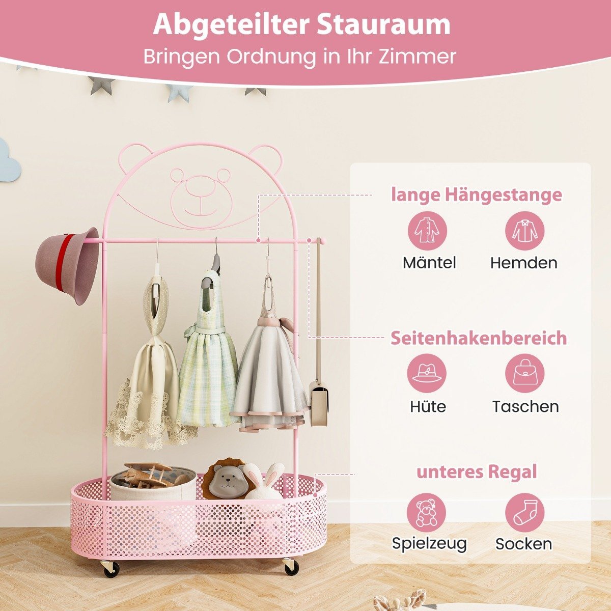 Užtikrinkite tvarką vaiko kambaryje su šia universalia ir žavia vaikiška drabužių kabykla. Ji reguliuojama net 3 aukščiais, todėl auga kartu su jūsų vaiku ir lengvai prisitaiko prie besikeičiančių poreikių. Tvirtas metalinis rėmas su apsauga nuo rūdijimo garantuoja ilgaamžiškumą ir patvarumą.