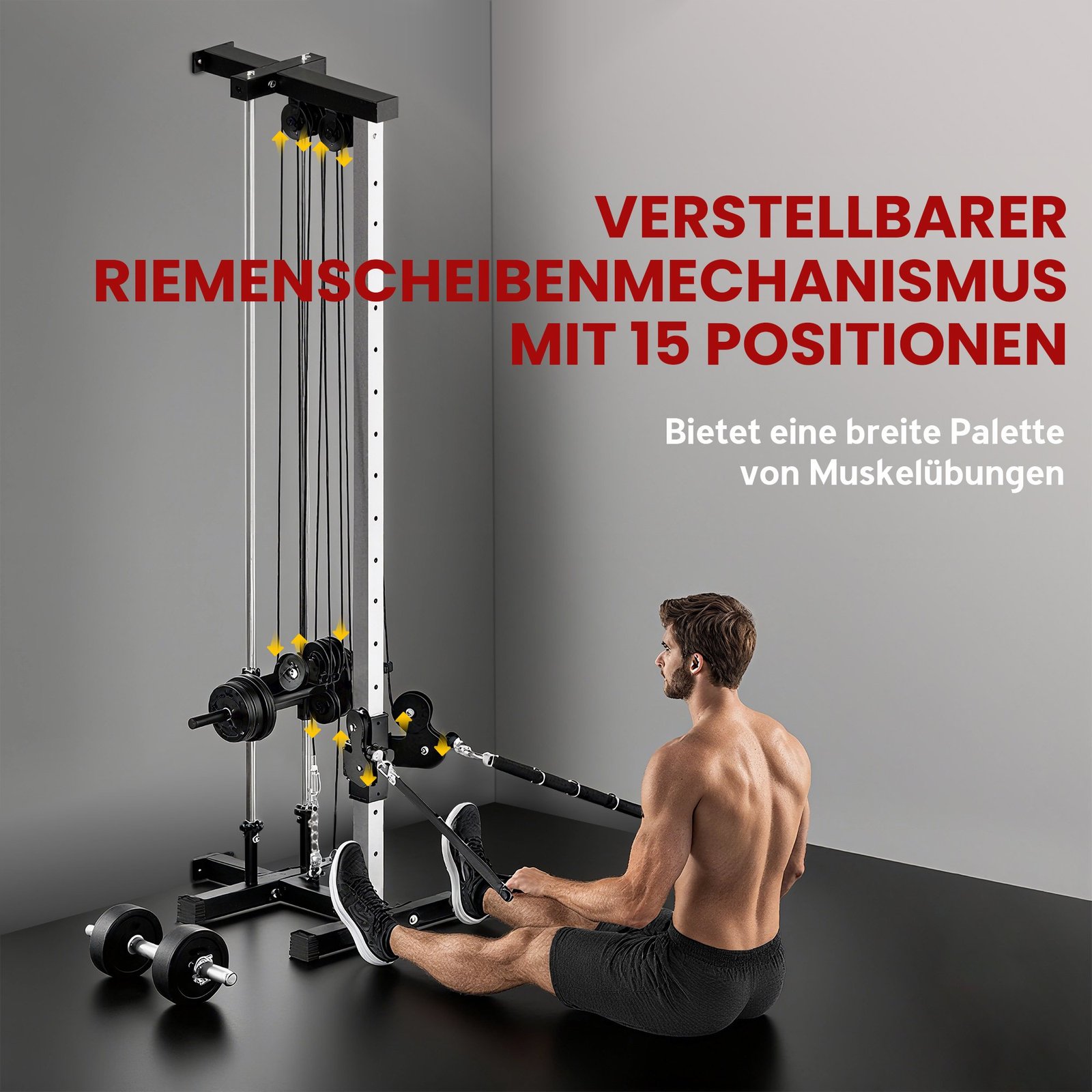 ✔ 15 reguliuojamų jėgos bokšto pozicijų su dvigubų skriemulių sistemomis, skirtomis įvairiems dvišaliams ir vienašaliams raumenų pratimams