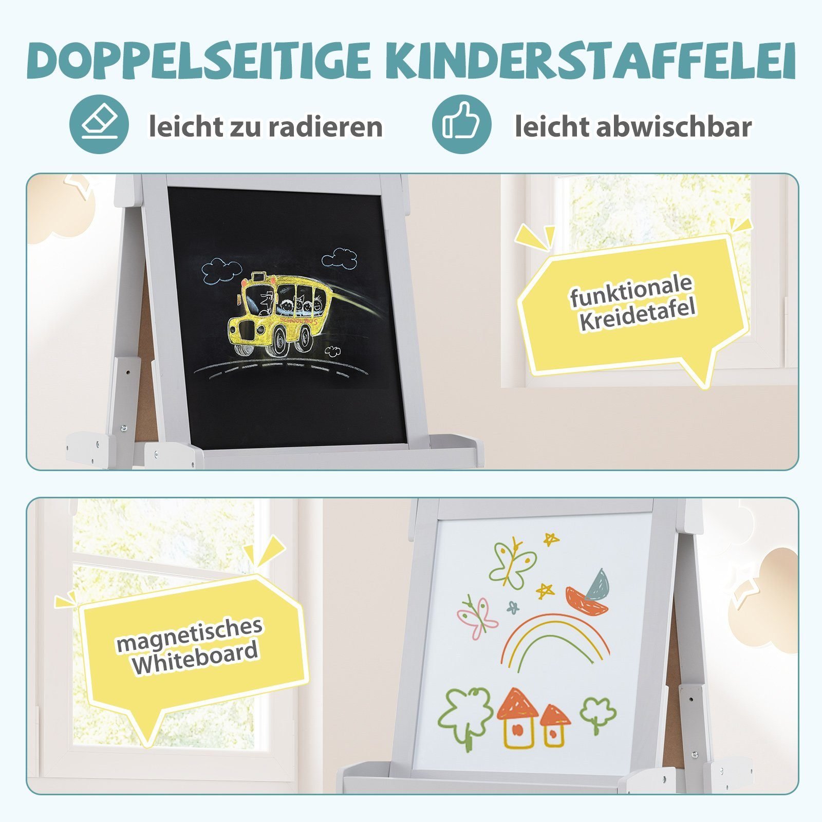 Ši dvipusė dailės lenta vaikams – puikus įrankis, skatinantis mažųjų menininkų kūrybiškumą. Joje rasite patogią baltą lentą ir magnetinę lentą, o keičiamas popieriaus ritinėlis suteikia neribotas piešimo galimybes.
